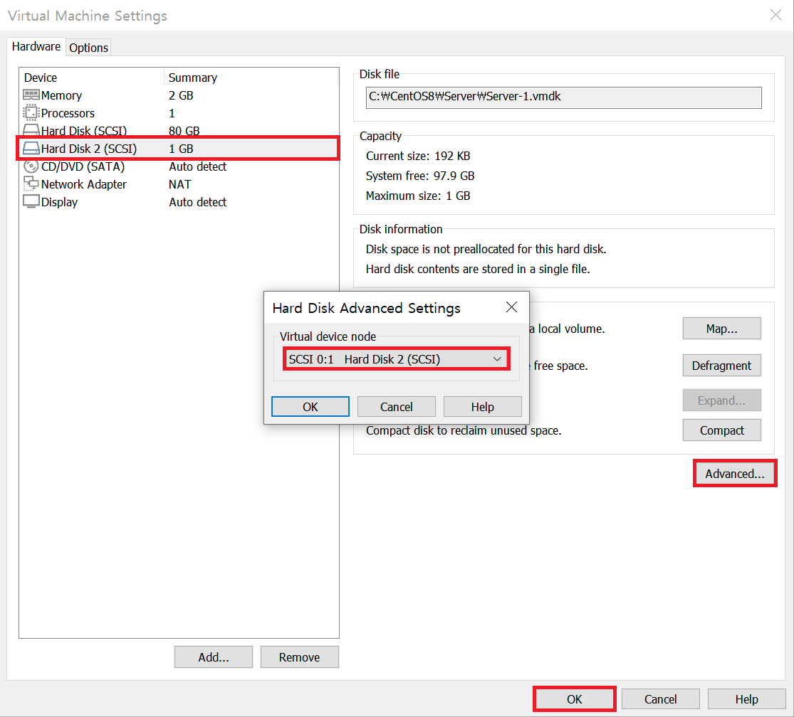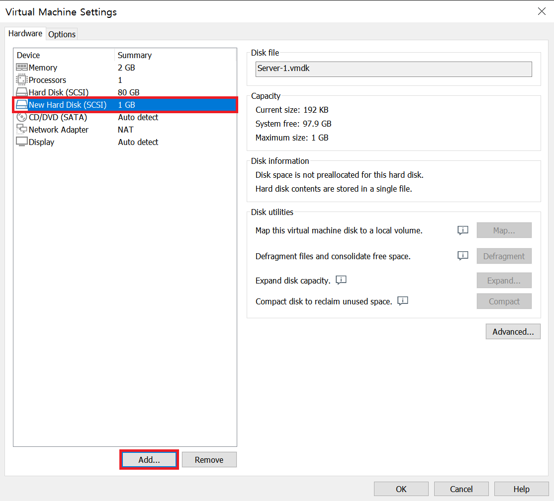 step 1 SCSI 0:1(/dev/sdb)에 1GB 하드디스크 하나를 장착하자.
