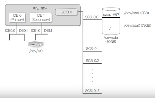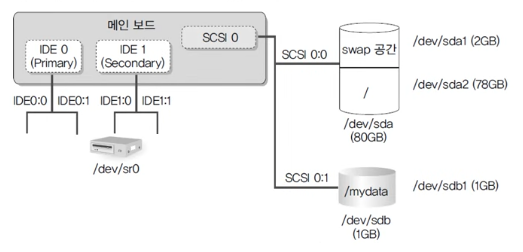 - 그림을 보면 Server 가상머신에 80GB SCSI 하드디스크를 장착하고 이 하드디스크를 2개의 파티션으로 나눴다. 리눅스에서는 처음 장착된 SCSI 하드디스크의 이름을 /dev/sda라고 부르며, 추가로 SCSI 하드디스크가 장착되면 /dev/sdb, /dev/sdc, /dev/sdd 등으로 부른다. 그리고 /dev/sda 장치에서 파티션을 나누는데 이 파티션은 순차적으로 1, 2, 3, 4를 붙여 /dev/sda1, /dev/sda2로 부른다.
