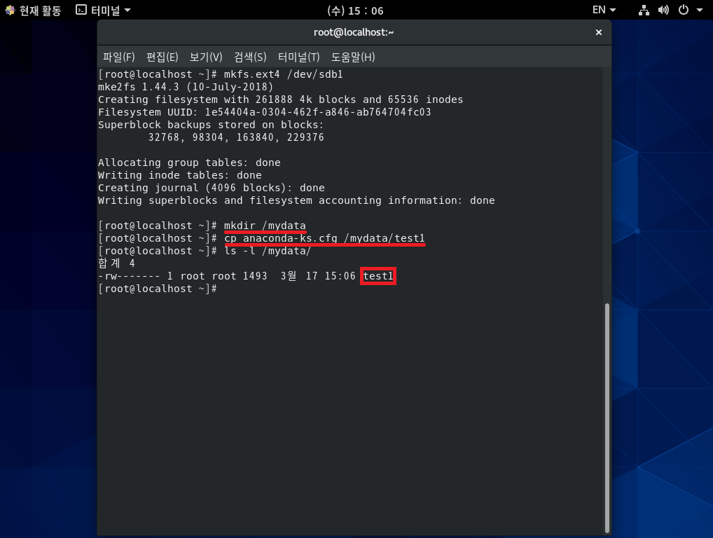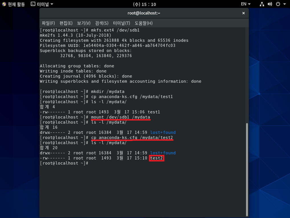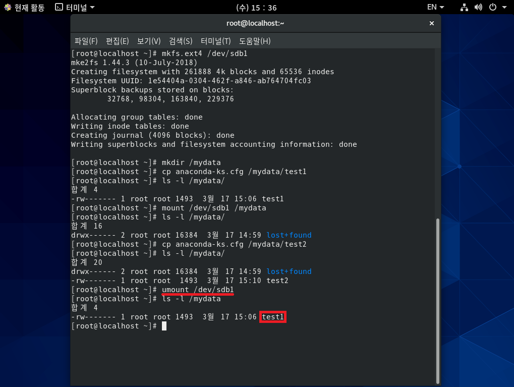 /dev/sda2에 있던 test1 파일은 없어진 것이 아니라 /mydata 디렉터리가 /dev/sdb1에 마운트되어 있기 때문에