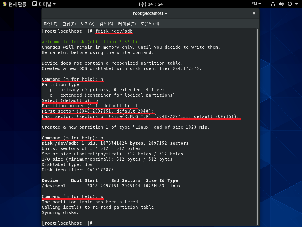 # fdisk /dev/sdb → SCSI 0:1 하드디스크 선택