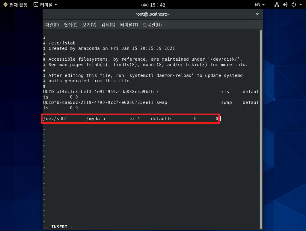 step 5 컴퓨터를 켤 때 /dev/sdb2 장치가 항상 /mydata에 마운트되어 있도록 설정하자.