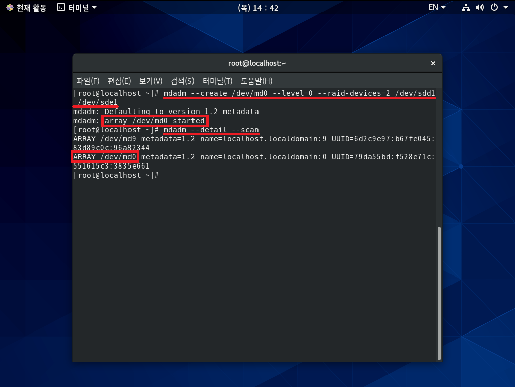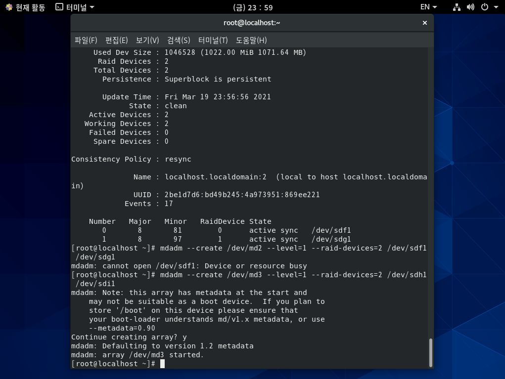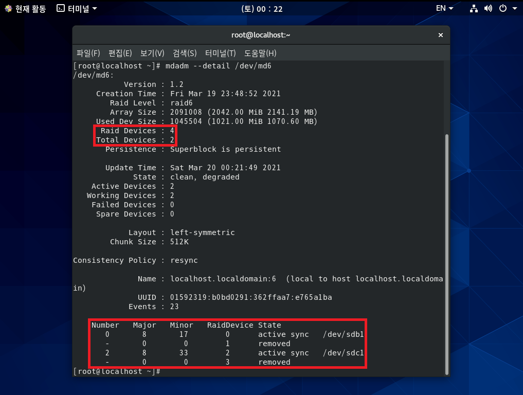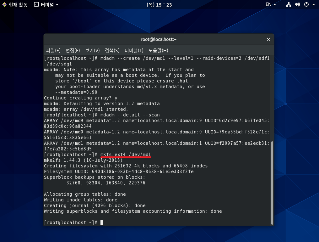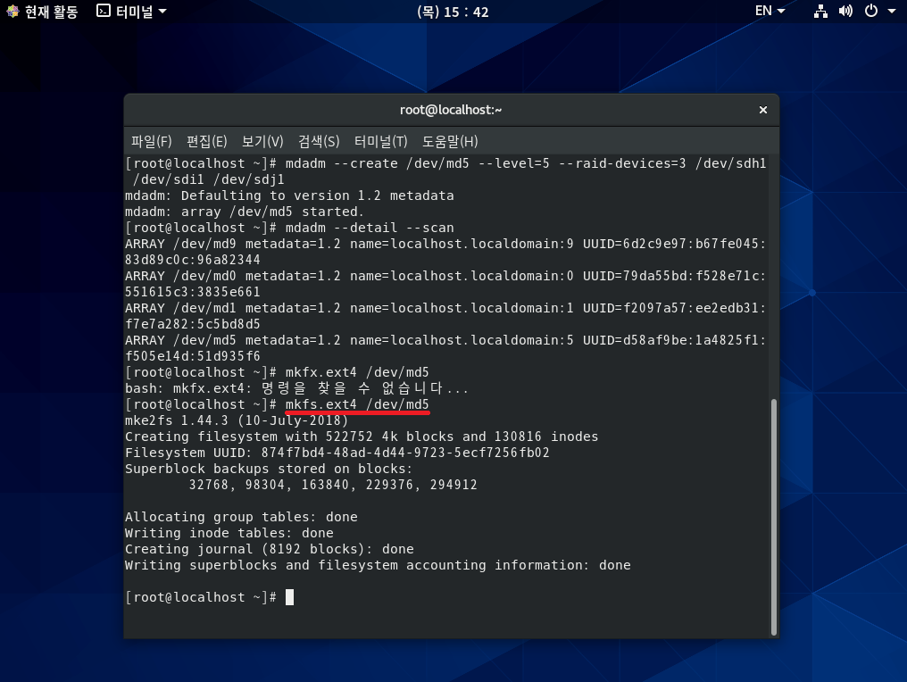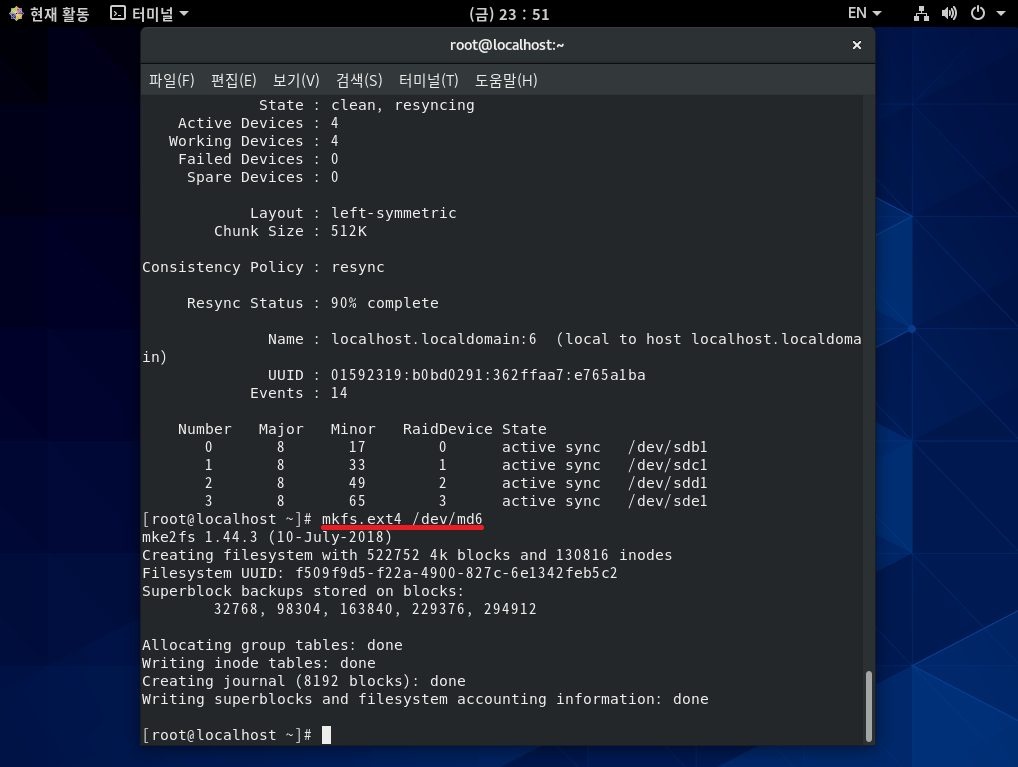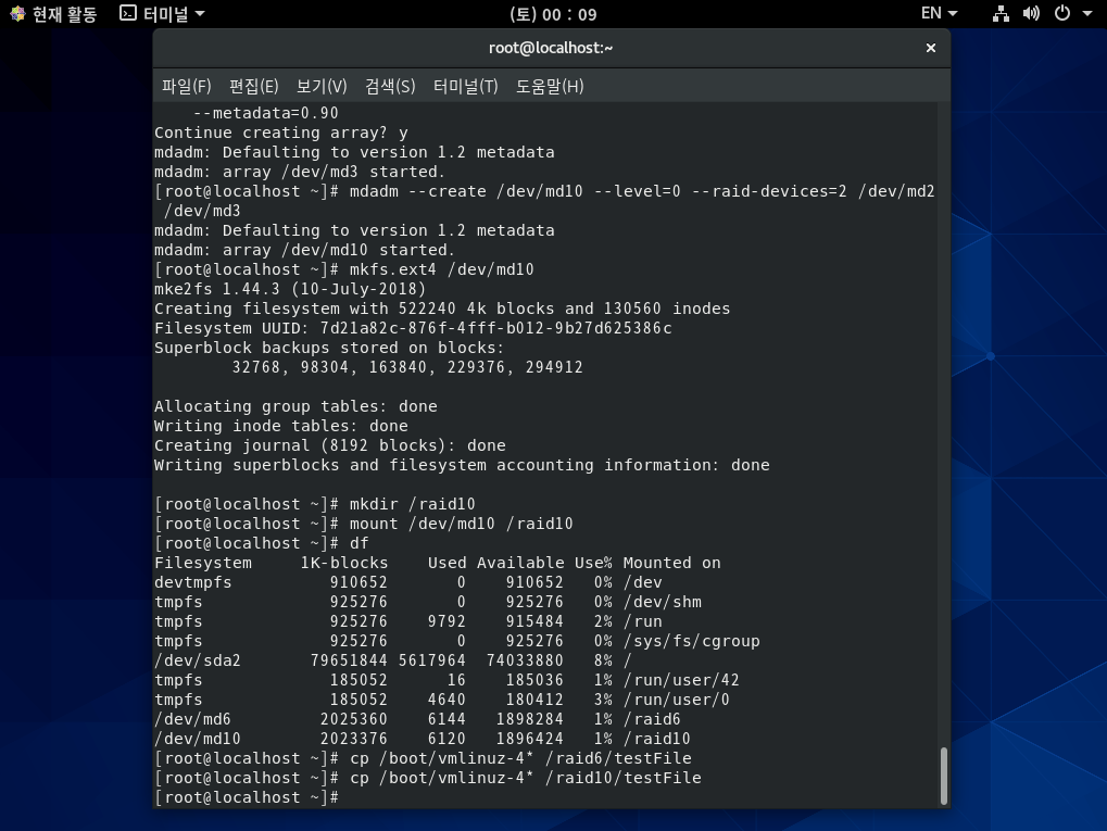 그러므로 RAID 0을 복구한 후에는 mkfs 명령으로 깨끗하게 포맷하는 것이 좋다. *