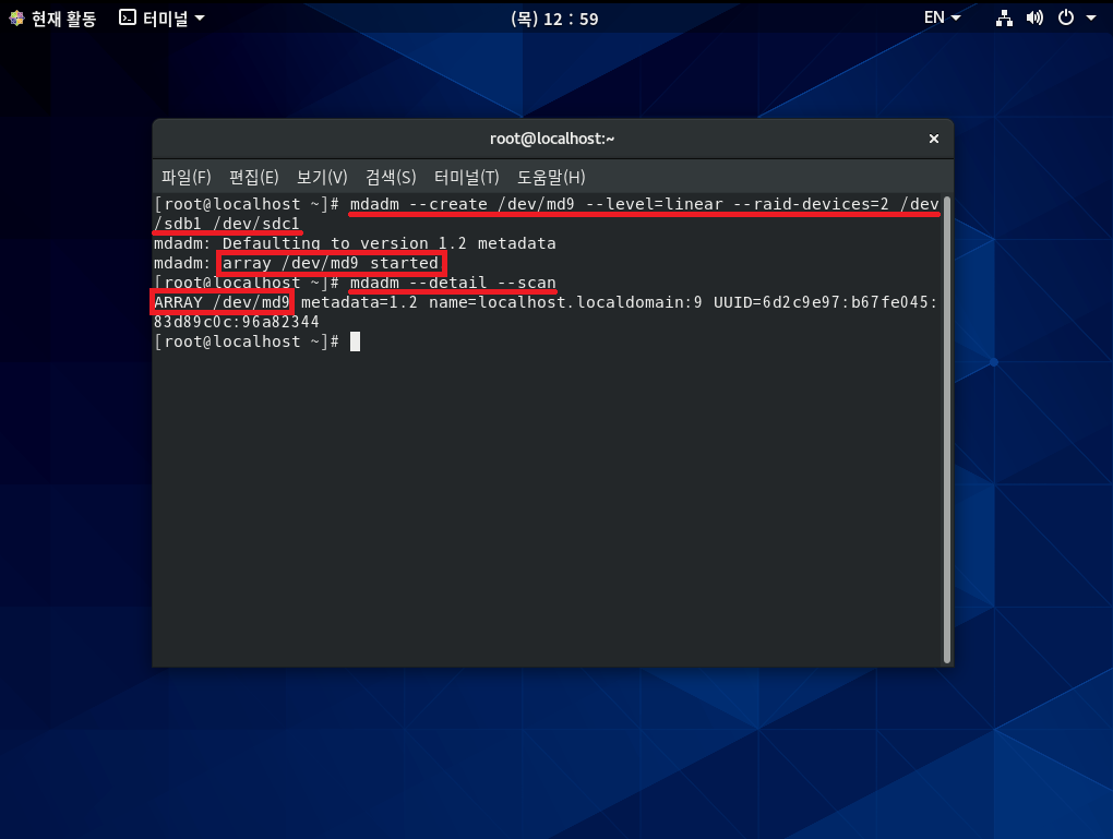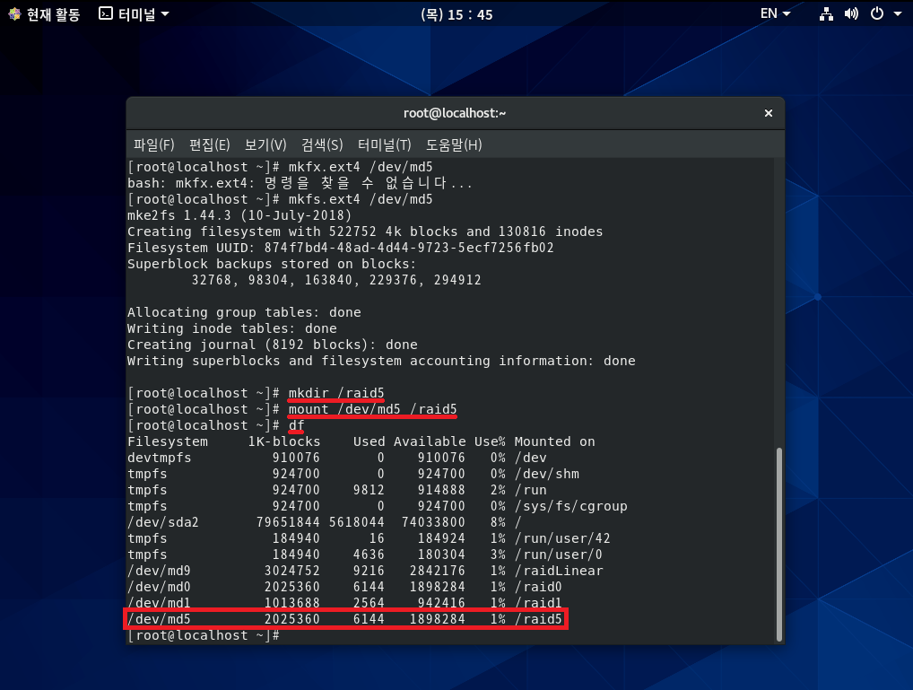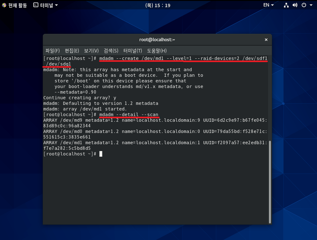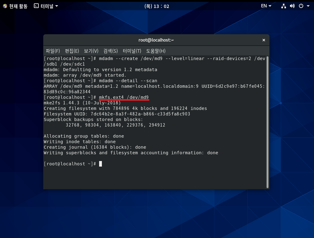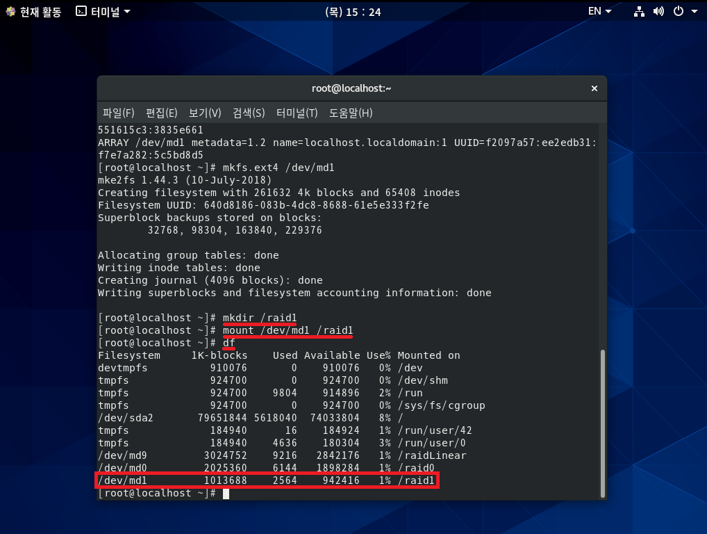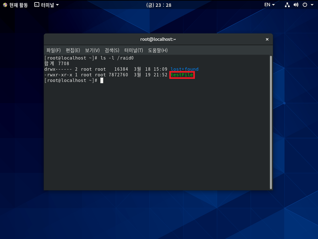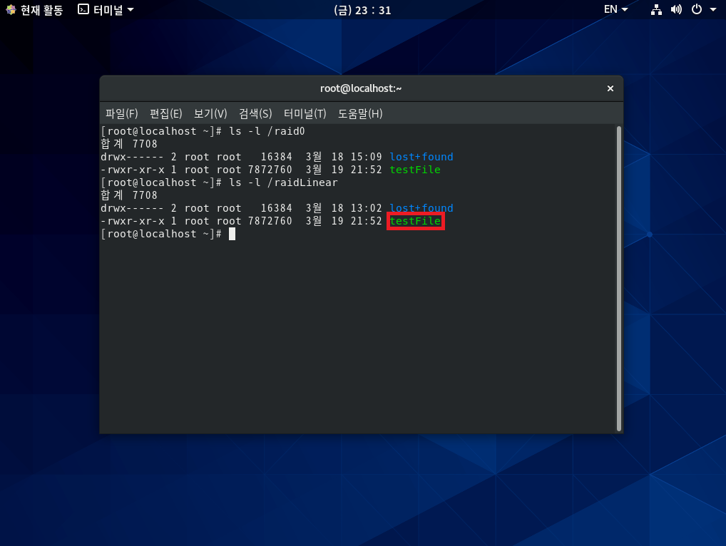 그러므로 RAID 0을 복구한 후에는 mkfs 명령으로 깨끗하게 포맷하는 것이 좋다. *