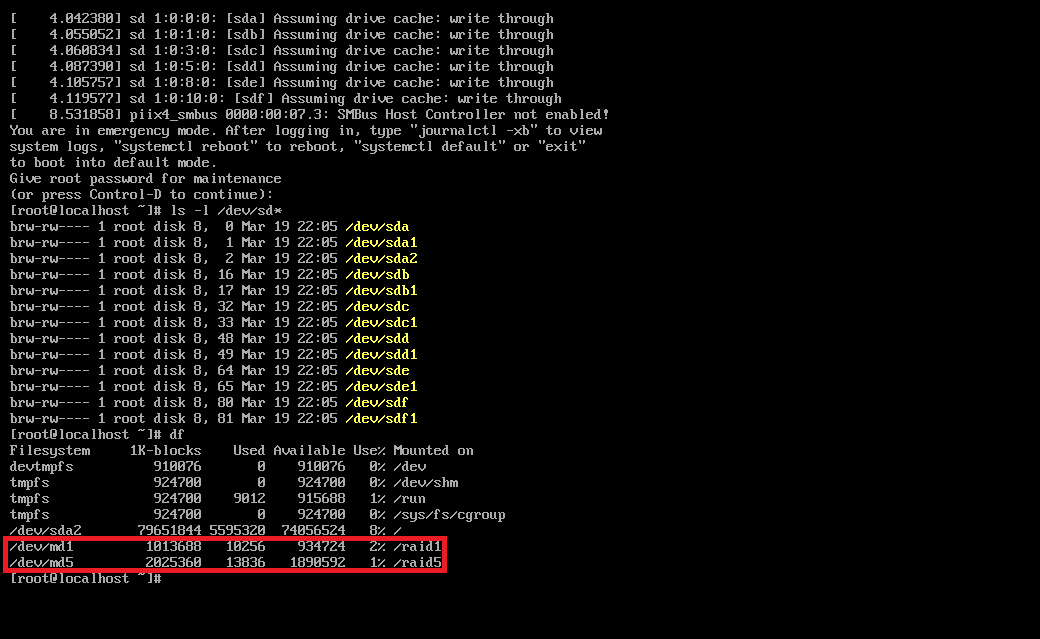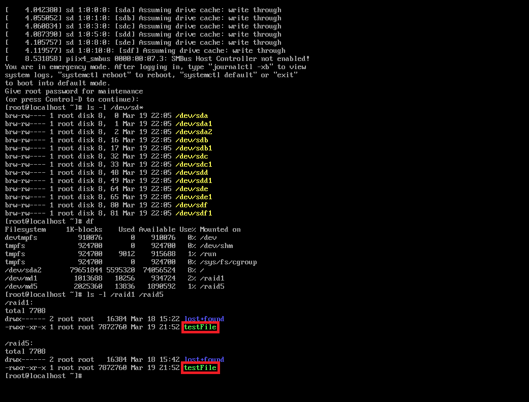 [실습 6] Linear RAID, RAID 0, 1, 5의 하드디스크가 고장 난 상황을 살펴보고, 정상적으로 부팅이 가능하도록 하자.