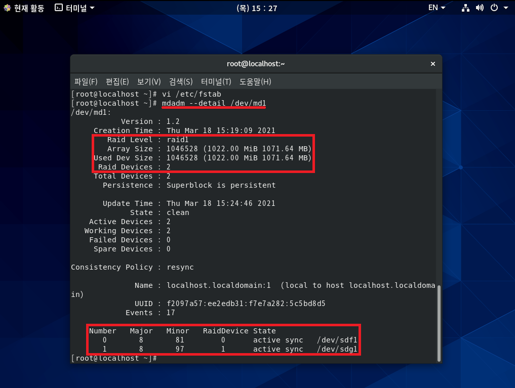 [실습 4] RAID 1을 구성해 보자. (/dev/sdf와 /dev/sdg로 구성)