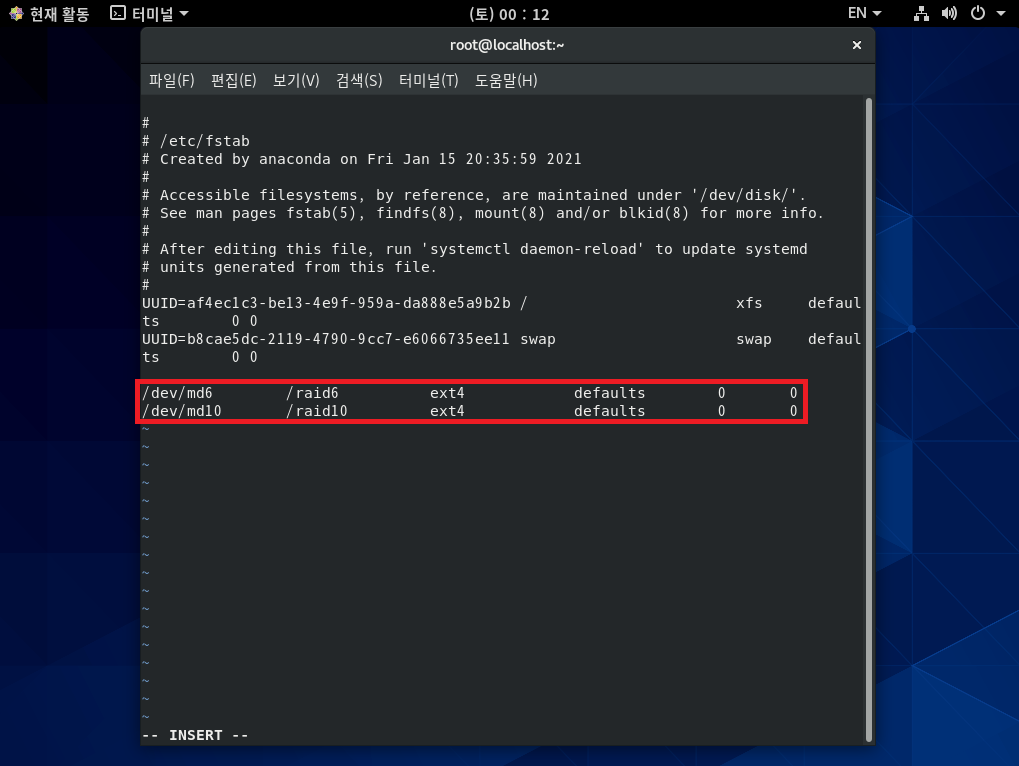 step 5 /dev/md6 장치는 /raid6 디렉터리에, /dev/md10 장치는 /raid10 디렉터리에 마운트되어 있도록 설정하자.