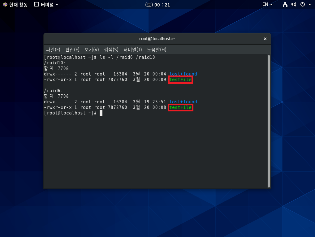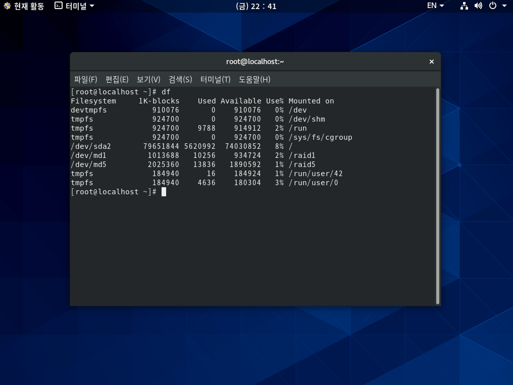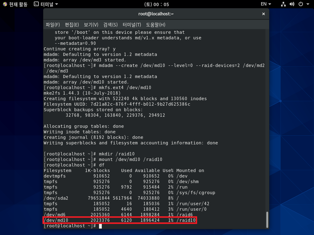 결과를 보면 /raid10 디렉터리에 약 2GB 정도의 공간이 있는 것을 확인할 수 있다. *