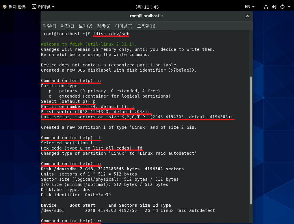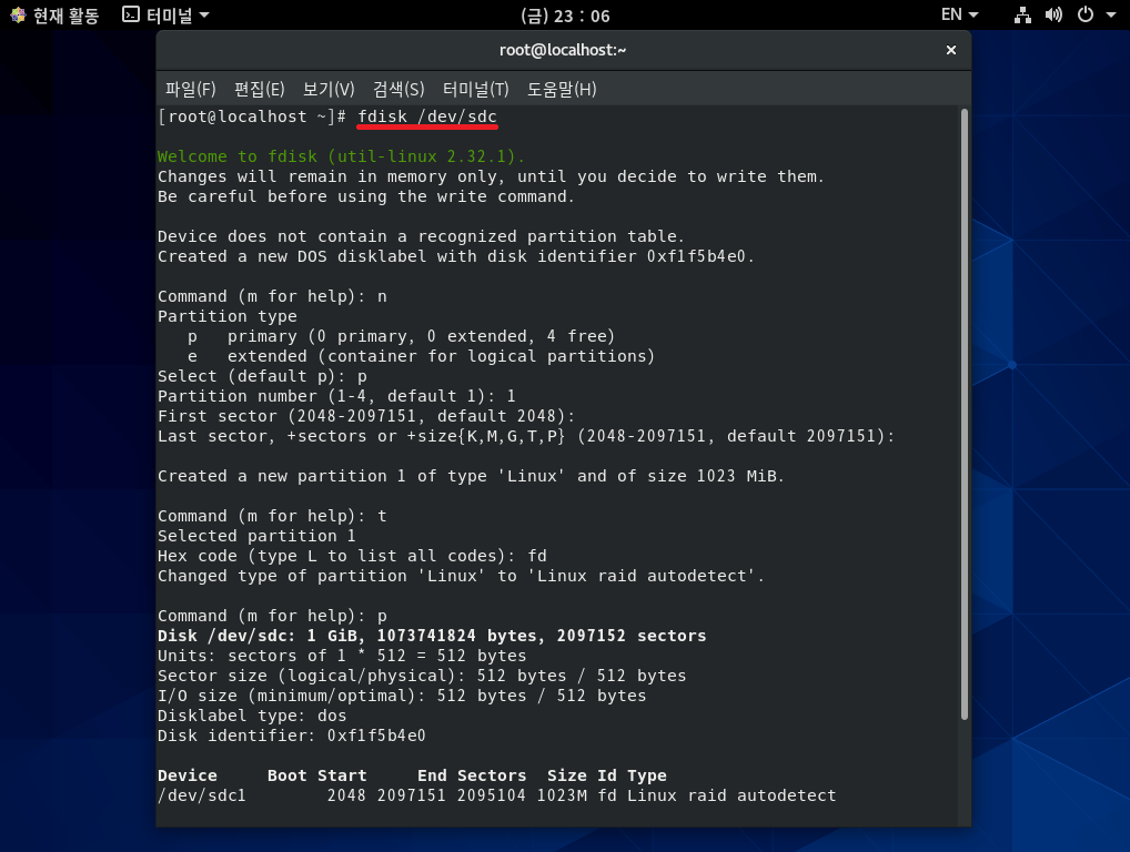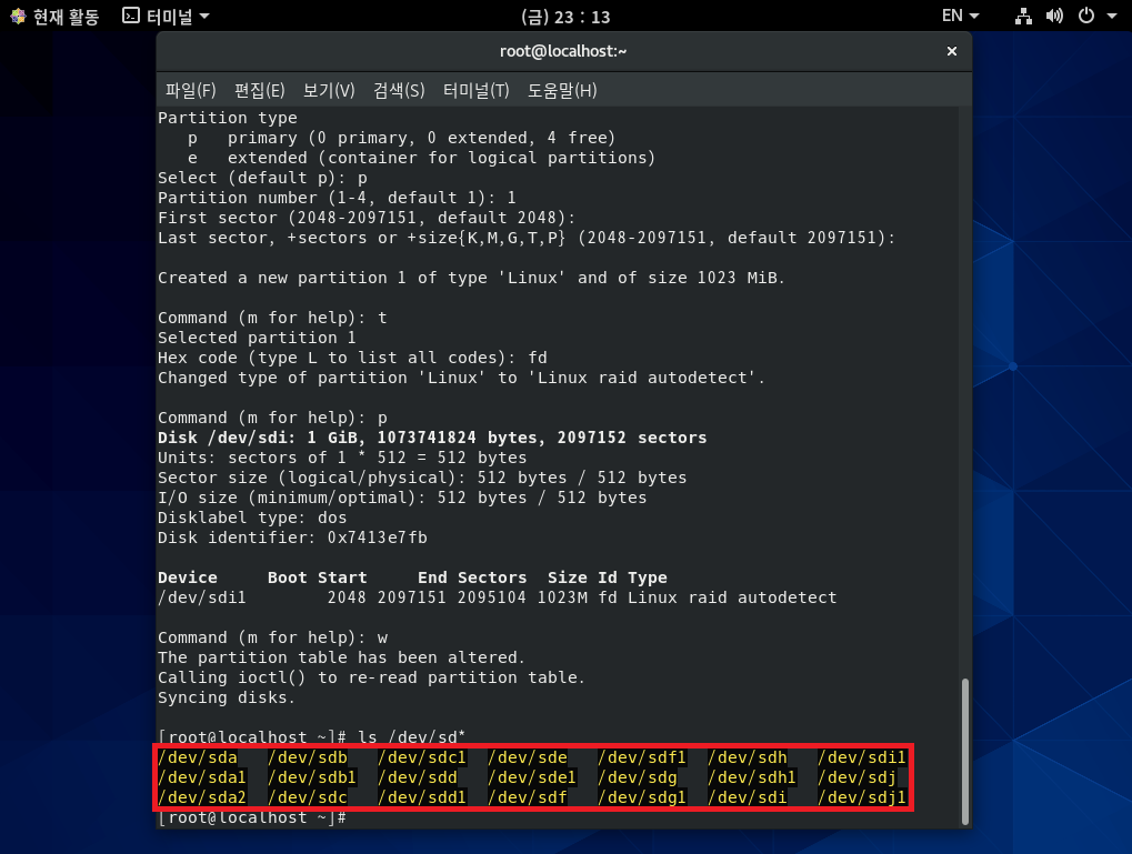 Hex Code : fd → 'Linux raid autodetect' 유형 번호(L을 입력하면 전체 유형이 출력됨)