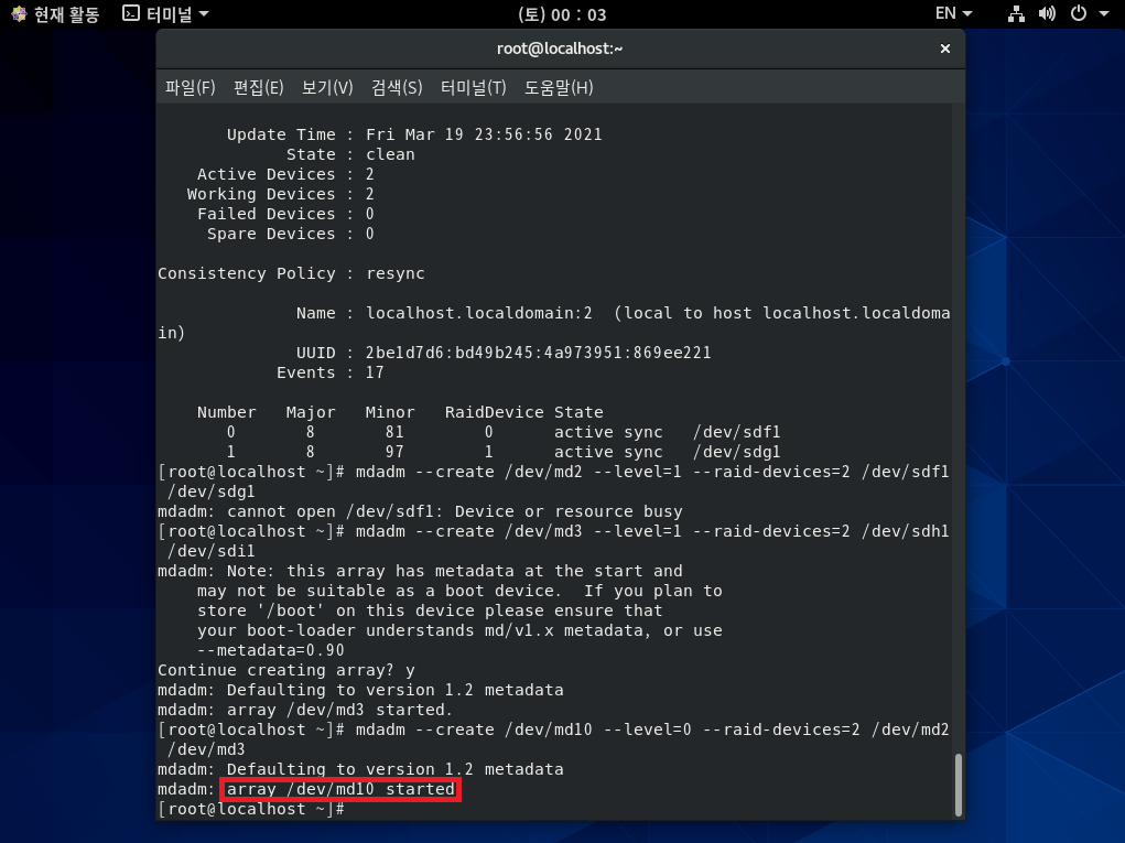step 3 /dev/sdf1~/dev/sdi1을 RAID 1+0 장치인 /dev/md10으로 생성하자.