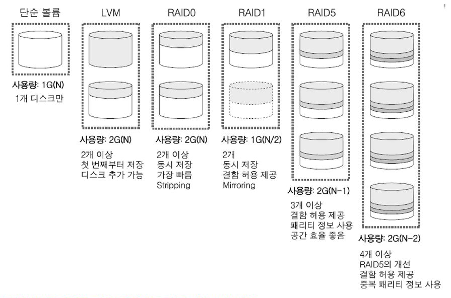 - 단순 볼륨과 많이 쓰이는 RAID 방식인 Linear RAID, RAID 0 , RAID 1, RAID 5, RAID 6를 비교하면 그림과 같다.