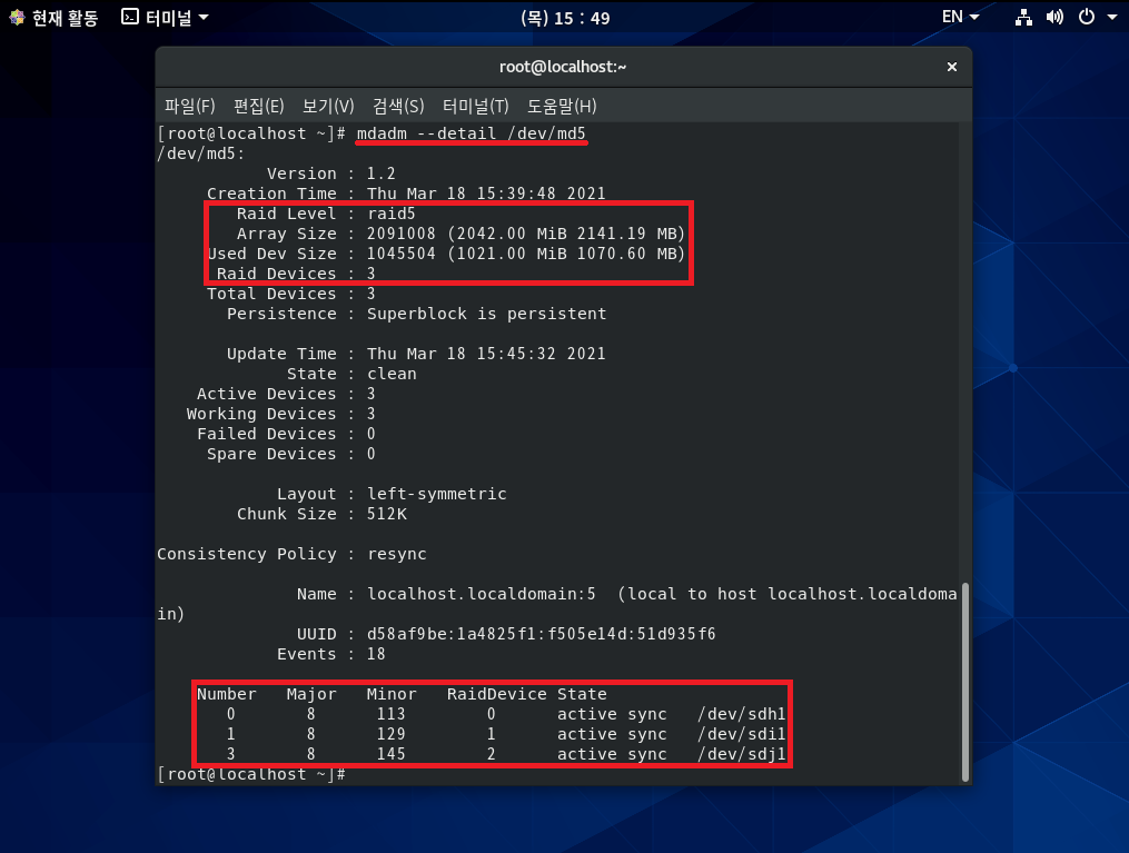 [실습 5] RAID 5를 구성해 보자. (/dev/sdh와 /dev/sdi, /dev/sdj로 구성)