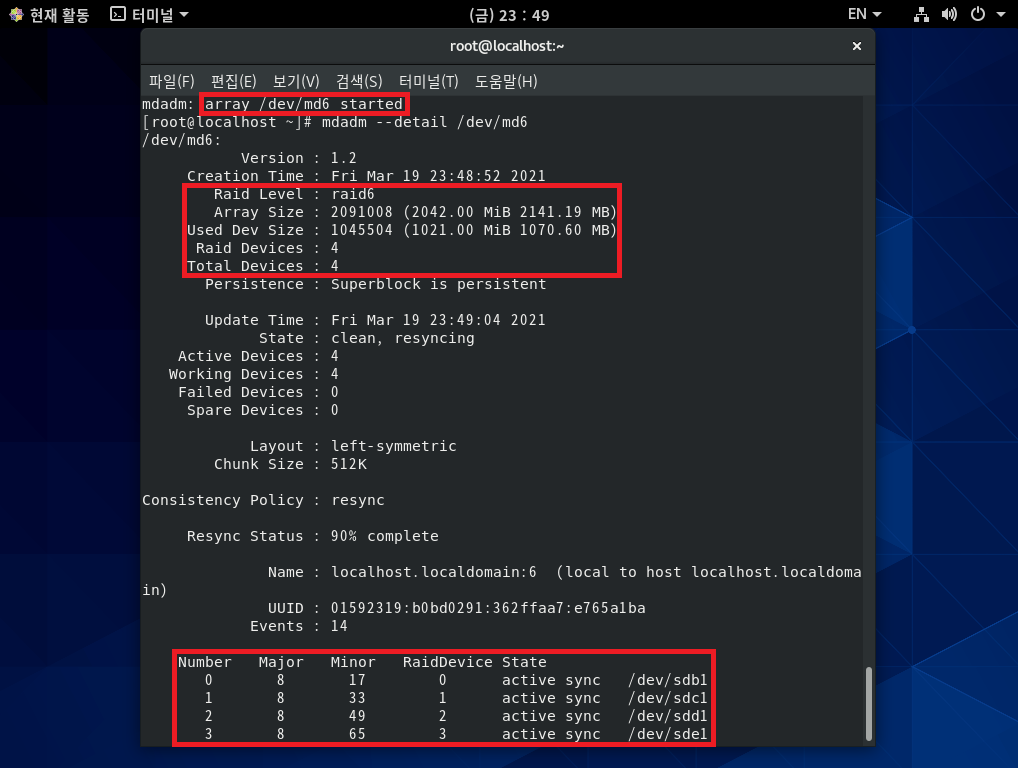 step 2 /dev/sdb1~/dev/sde1을 RAID 6 장치인 /dev/md6로 생성하자.