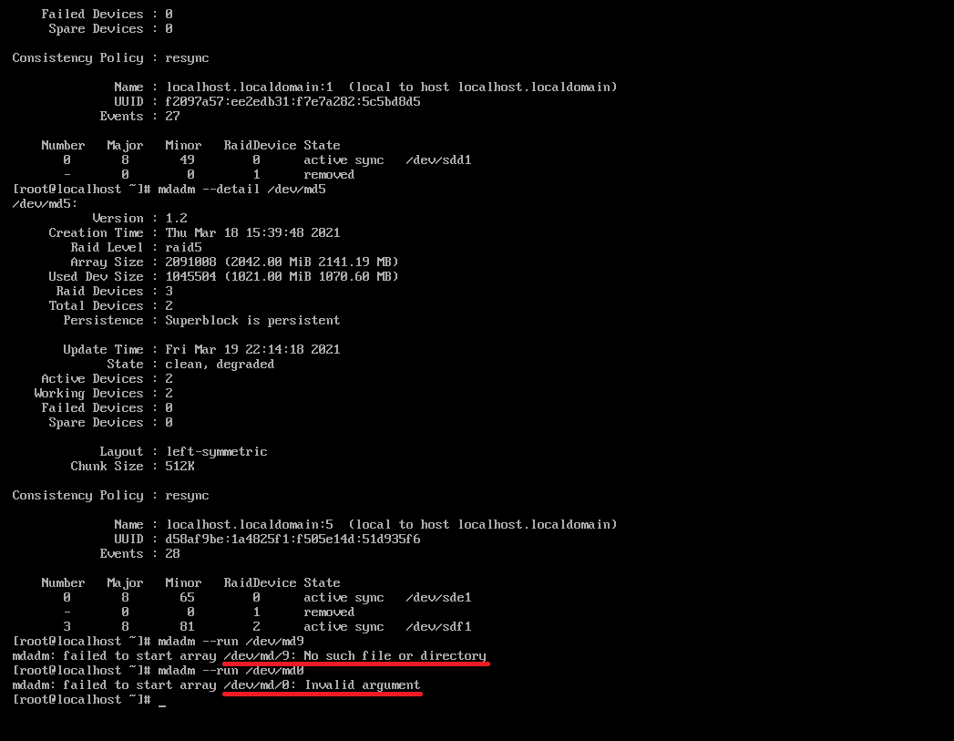 [실습 7] Linear RAID, RAID 0, 1, 5 장치의 고장난 하드디스크를 새로운 하드디스크로 교체하자.