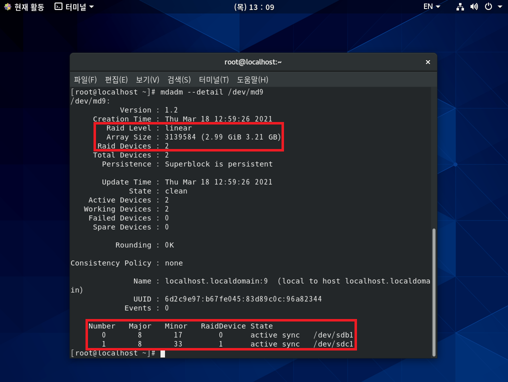 * /dev/md0 장치는 RAID 0이므로 하드디스크 용량을 모두 사용한다.