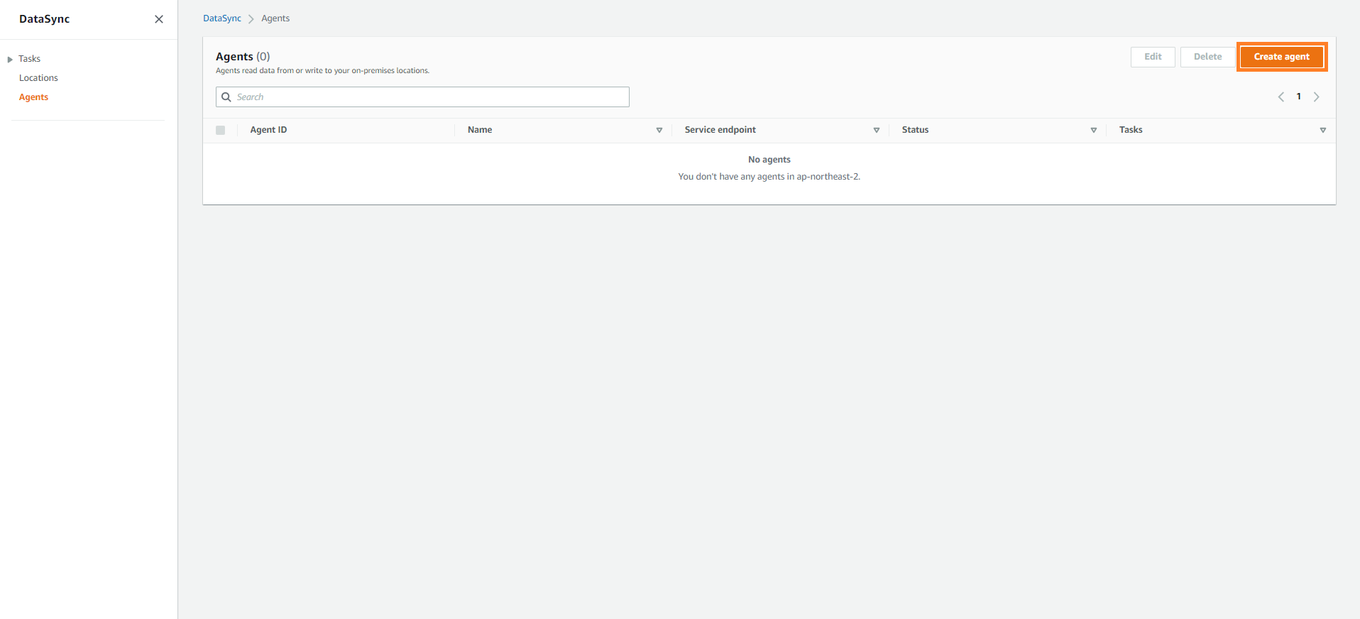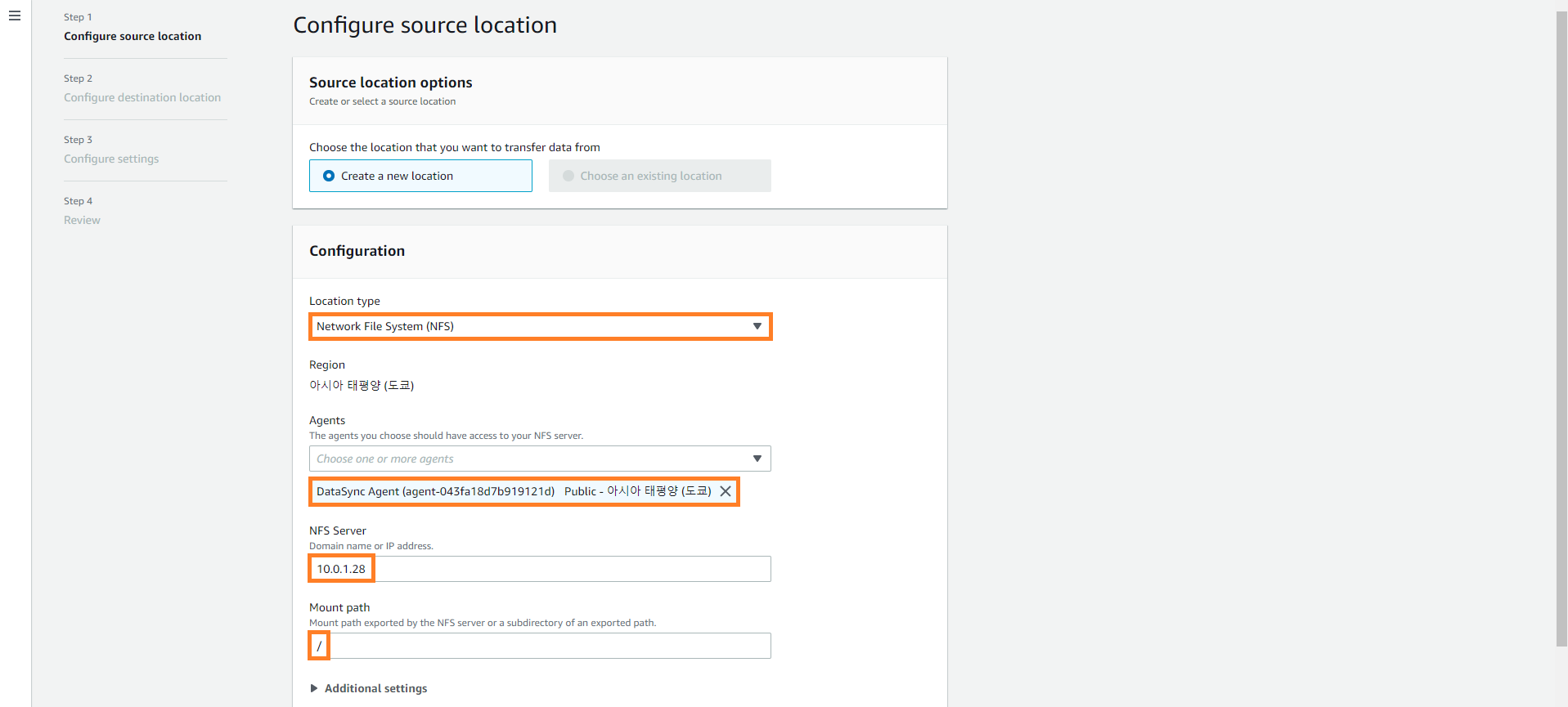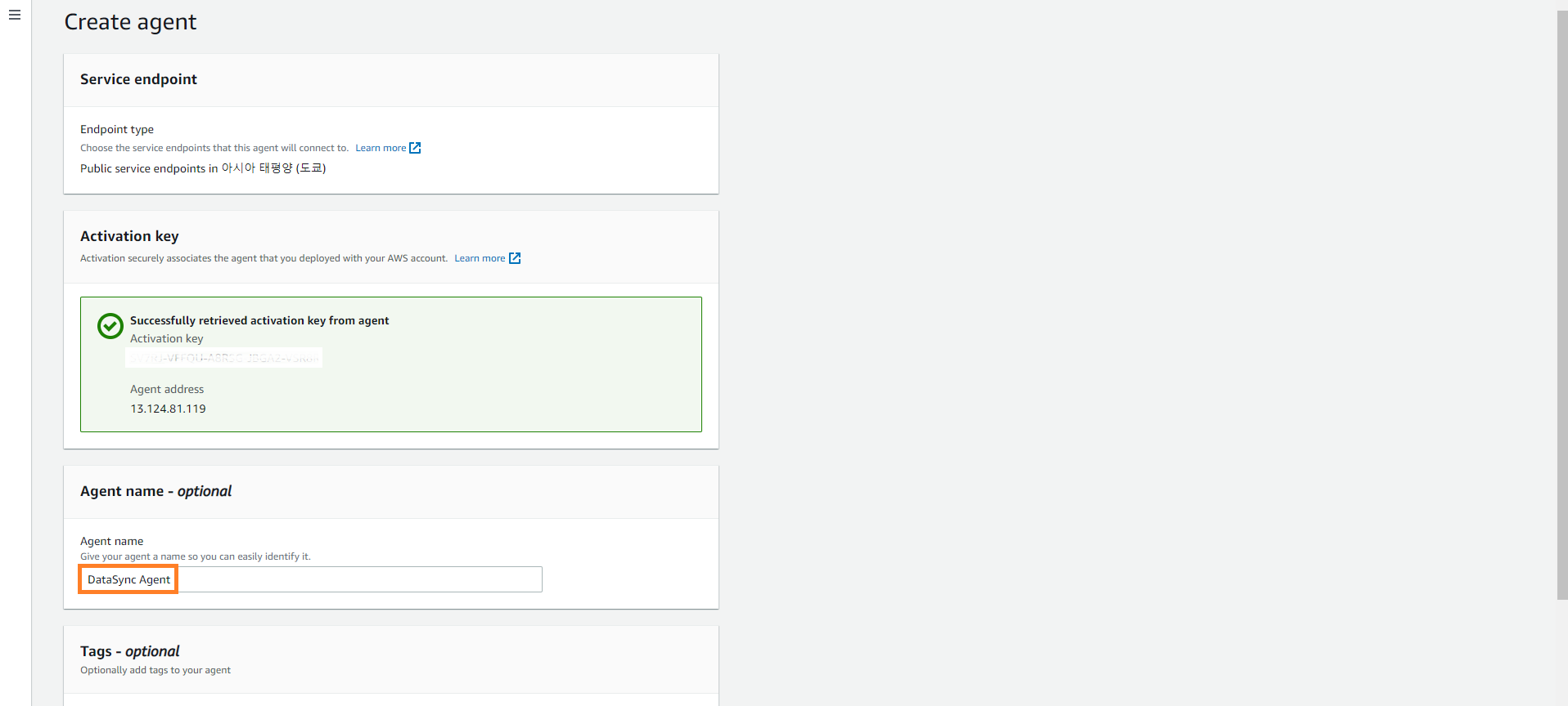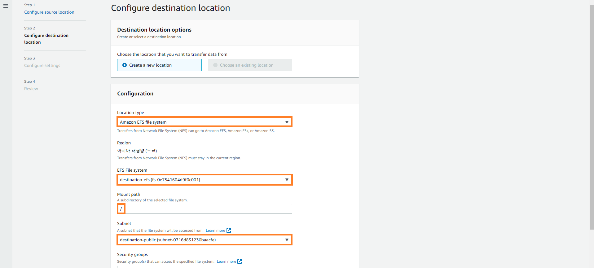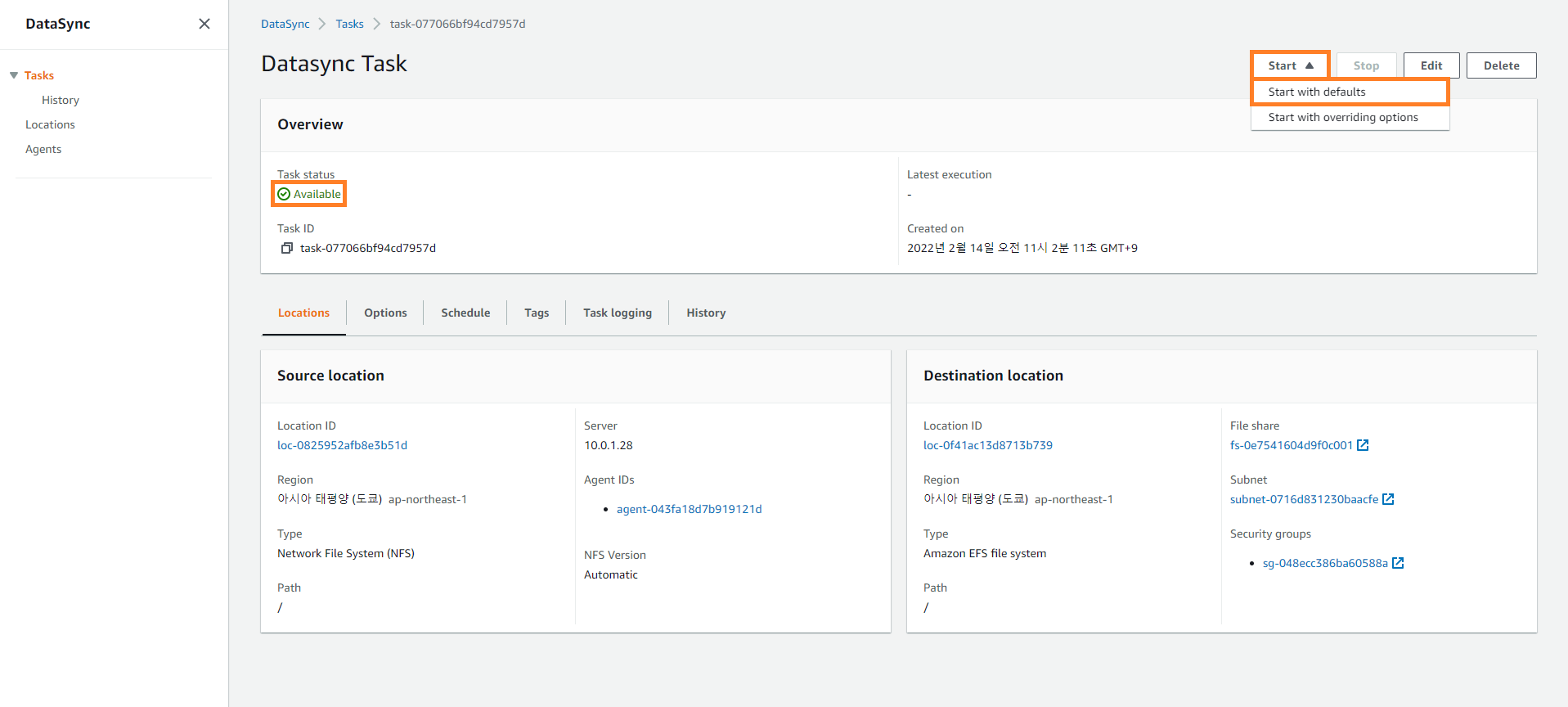도쿄 리전의 DataSync 콘솔에서 Agents를 선택한 후, Create agent를 클릭합니다.이전에 생성한 DataSync Agent 인스턴스에 에이전트를 배포하기 위해 위와 같이 선택한 후, 에이전트 주소에 DataSync Agent 인스턴스의 퍼블릭 주소를 입력하고, 맨 아래 Get Key를 클릭합니다.키가 자동으로 생성된 것을 확인할 수 있고, 에이전트 이름을 입력한 후, 맨 아래 Create agent를 클릭합니다.다시 DataSync 콘솔에서 Tasks를 선택한 후, Create task를 클릭합니다.Source의 Location type은 NFS을, Agents는 방금 생성한 에이전트를 선택하고, NFS Server에 Source EFS의 IP 주소를 입력합니다. 그리고 Mount path는 "/"로 입력하는데, /mnt/efs/fs1 경로를 마운트하였기 때문에 /mnt/efs/fs1 경로가 루트로 설정됩니다.Destination의 Location type은 EFS를, EFS는 Destination EFS를 선택합니다. 그리고 Mount path는 마찬가지로 "/"를 입력하고, Destination EFS가 액세스할 서브넷과 이전에 생성한 EFS 보안 그룹을 선택합니다.작업 이름을 입력한 후, 나머지는 디폴트로 두고 맨 아래 Next 버튼을 클릭합니다.설정한 내용들을 확인한 후, 맨 아래 Create task를 클릭합니다.작업의 상태가 Available되면 Start에서 Start with defalts를 클릭합니다.작업이 성공하면 History 항목의 상태가 Running에서 Success로 바뀌는 것을 확인할 수 있습니다.