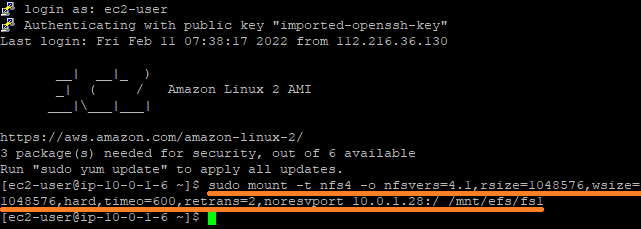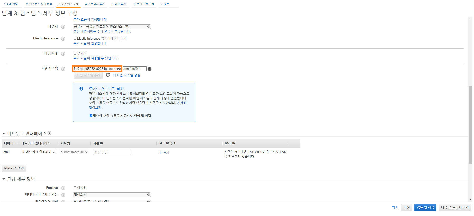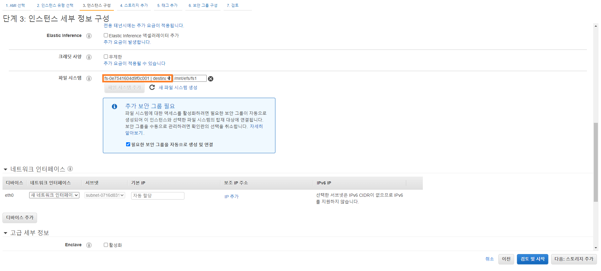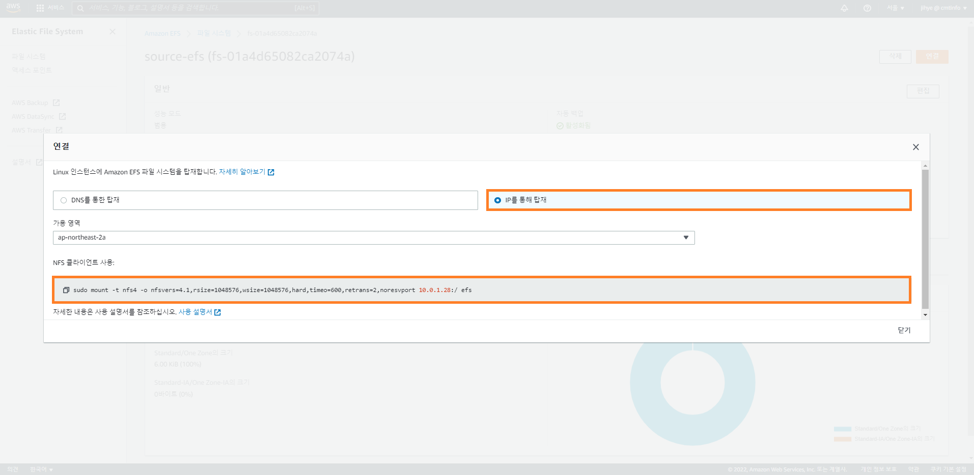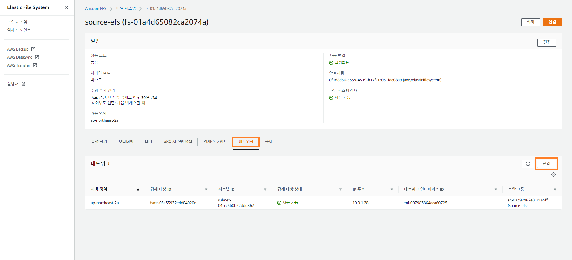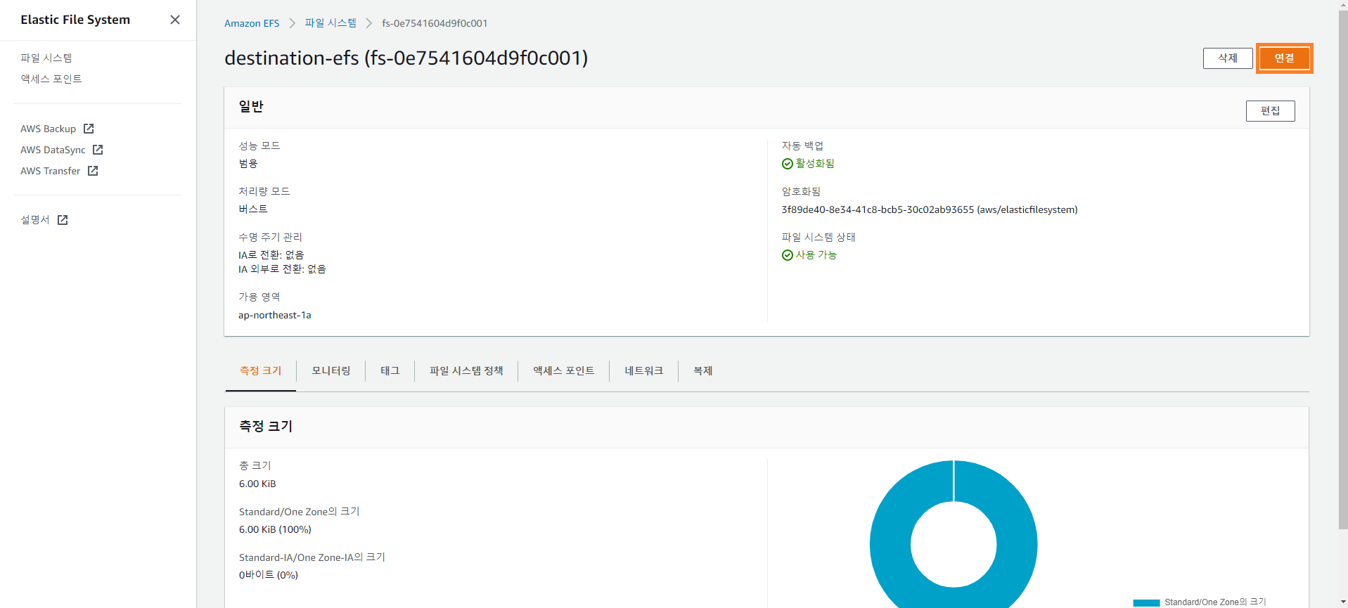 마찬가지로 도쿄 리전에 VPC와 Subnet을 생성한 후, EFS 콘솔에서 파일 시스템을 선택하여 파일 시스템 생성을 클릭합니다.이름에 destination-efs를 입력하고, 해당 VPC와 가용 영역을 선택한 후, 생성을 클릭합니다.그리고 NFS 2049 포트를 허용하는 EFS 보안 그룹을 생성합니다.Destination EFS에서 네트워크 항목의 관리를 클릭합니다.기존의 보안 그룹을 제거한 후, 생성한 보안 그룹을 선택하여 저장합니다.Destination EFS를 탑재한 인스턴스를 생성합니다. 인스턴스 생성 시 생성한 파일 시스템을 추가하면 됩니다.그리고 NFS 2049 포트를 통한 트래픽을 허용할 수 있도록 보안 그룹을 구성하여 인스턴스를 생성합니다.EFS 콘솔에서 Destination EFS를 선택한 후, 연결을 클릭합니다.IP를 통해 탑재를 선택한 후, NFS 클라이언트 사용 명령을 복사합니다.해당 EFS를 탑재한 인스턴스에 접속한 후, 복사한 명령을 입력하여 /mnt/efs/fs1 경로에 마운트합니다."df -h" 명령을 입력하여 마운트되었는지 확인합니다.