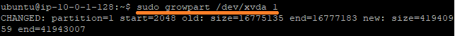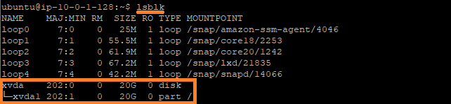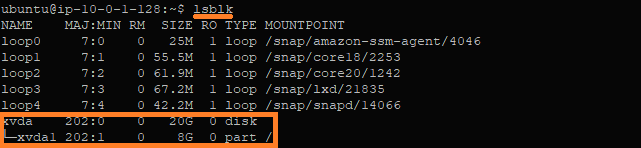 루트 볼륨 /dev/xvda에는 /dev/xvda1이라는 파티션이 있습니다. 볼륨의 크기는 확장된 크기인 20GB이고, 파티션의 크기는 여전히 8GB이기 때문에 파티션의 크기를 늘려야 합니다.