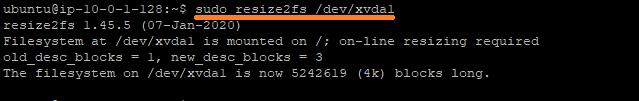 ex4 볼륨일 경우, sudo resize2fs /dev/xvdf1 명령을 통해 파일 시스템을 확장합니다.