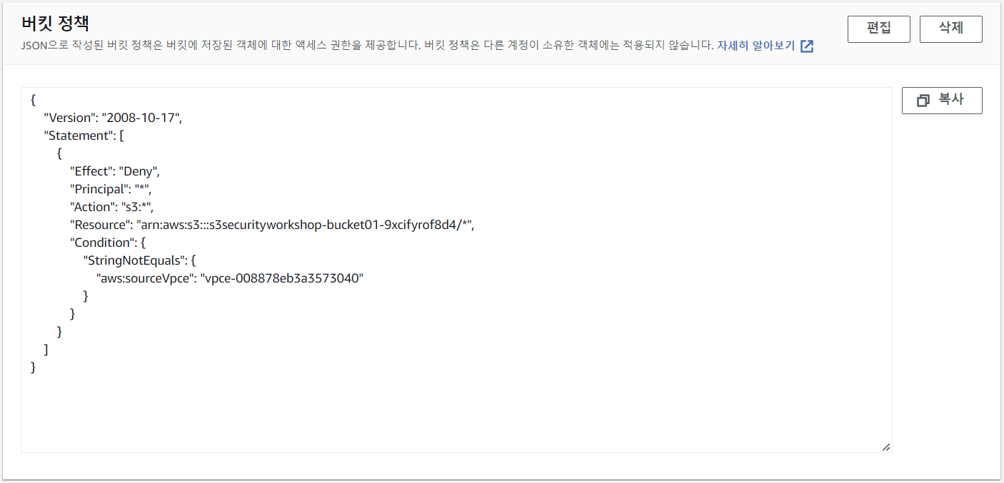 Amazon S3는 버킷에 액세스할 수 있는 VPC 엔드포인트를 지정할 수 있습니다. "aws:sourceVpce" 조건을 사용하여 해당 VPC 엔드포인트에서 온 요청이 아니면 버킷에 대한 트래픽을 차단할 수 있습니다.위의 정책을 사용하려면 S3에 대한 VPC 엔드포인트를 연결해야 하며, VPC 엔드포인트는 EC2 인스터스 서브넷의 라우팅 테이블에 연결되어야 하고, 버킷과 동일한 AWS 리전에 있어야 합니다. 따라서 실행 중인 인스턴스는 이 모든 조건을 만족하기 때문에 요청이 성공하는 것을 확인할 수 있습니다.