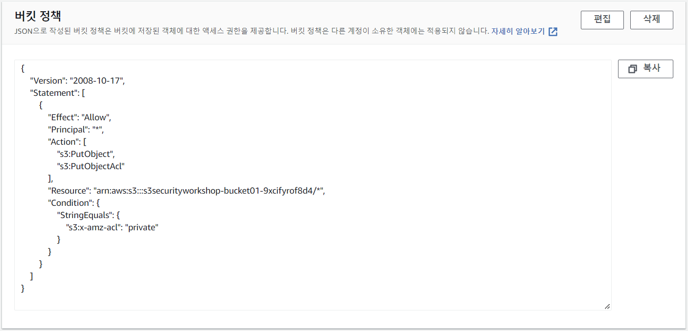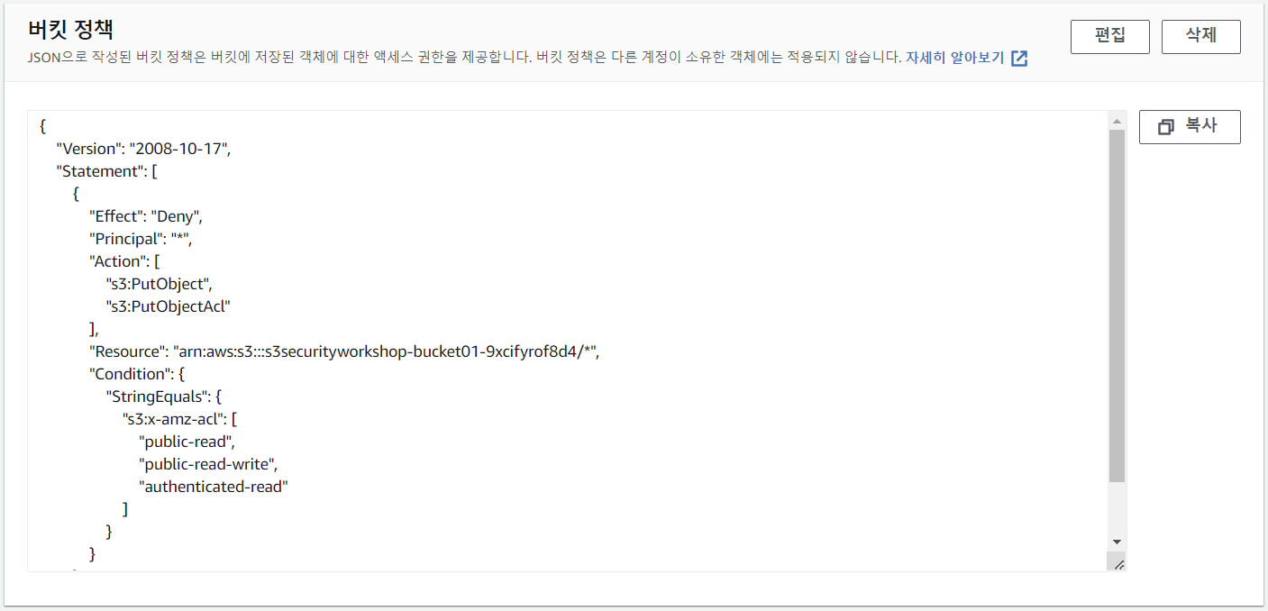 Amazon S3는 미리 준비된 ACL이라고 하는 미리 정의된 권한 부여 세트를 지원합니다. 미리 준비된 ACL에는 피부여자 및 권한 집합이 미리 정의되어 있습니다. (참고: https://docs.aws.amazon.com/AmazonS3/latest/userguide/acl-overview.html#canned-acl)위와 같이 버킷 정책을 편집한 후, 객체를 PUT합니다. 현재 버킷 정책은 private ACL을 허용하지만 아무것도 거부하지 않기 때문에, 두번째 명령어인 public-read ACL을 의도하지 않게 허용하는 것을 확인할 수 있습니다.따라서 버킷에 대한 작업을 제한하려고 할 때, 허용하지 않고 작업을 방지하는 정책을 작성하는 것이 중요합니다.위와 같이 버킷 정책을 편집한 후, 다시 객체를 PUT합니다. 이번에는 public-read ACL을 제한하였으므로 두번째 명령어의 요청이 실패하는 것을 확인할 수 있습니다.