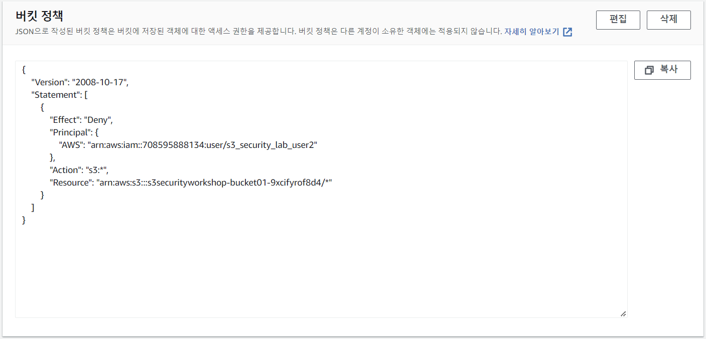Amazon S3는 특정 IAM 사용자에게 권한을 부여할 수 있습니다. Principal 요소에 해당 IAM 사용자의 ARN을 입력하여 버킷에 대한 트래픽을 차단할 수 있습니다.user2만 버킷에 대한 트래픽을 차단하였기 때문에 user1의 요청은 성공하는 것을 확인할 수 있습니다.