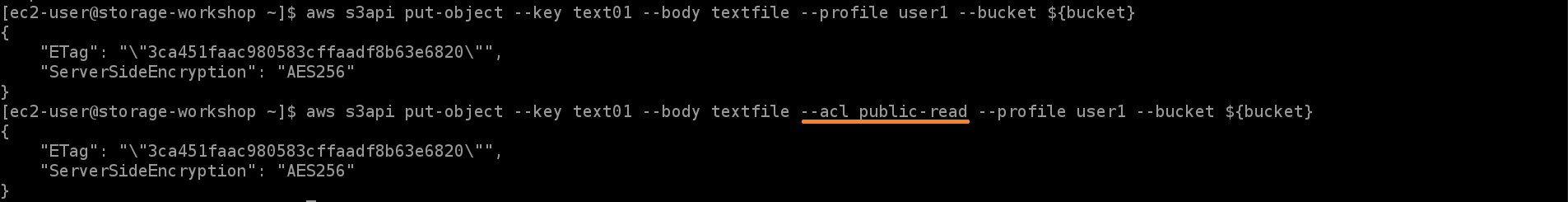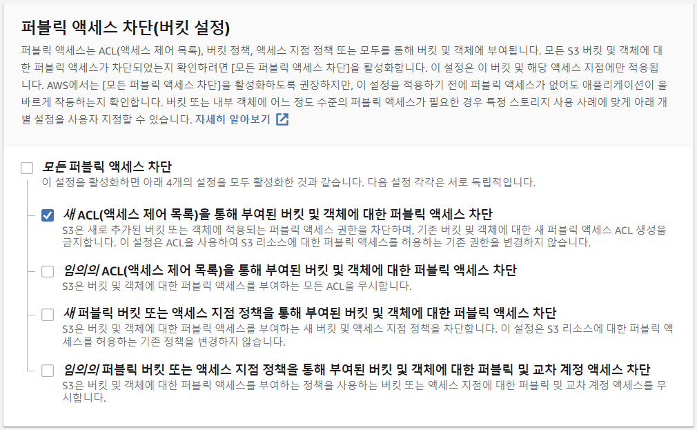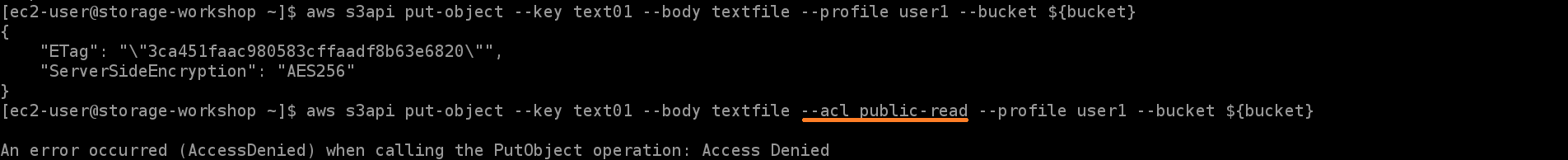 버킷에 대한 public 액세스를 방지하는 방법에는 버킷 정책을 편집하는 방법도 있지만, S3 Block Public Access를 통해 더 쉽게 구성하는 방법도 있습니다.위와 같이 S3 Block Public Access를 구성한 후, 다시 객체를 PUT합니다. 새로운 ACL을 통해 부여된 버킷 및 객체에 대한 퍼블릭 액세스 차단을 선택하였기 때문에 두번째 명령어의 요청이 실패하는 것을 확인할 수 있습니다.