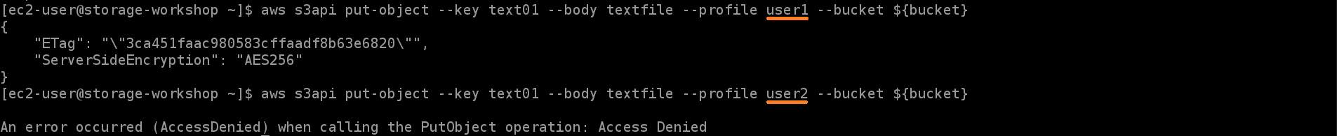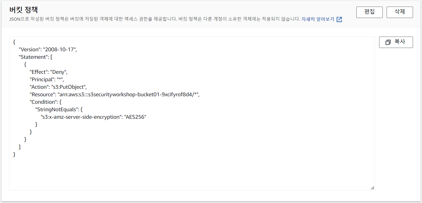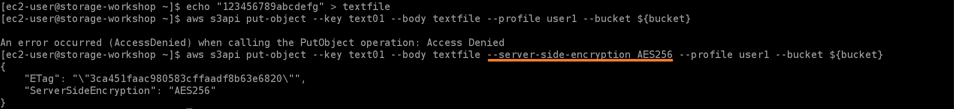 Amazon S3는 관리형 암호화 키(SSE-S3)로 서버 측 암호화를 사용하여 데이터를 보호합니다. 버킷에 저장된 모든 객체에 대해 서버 측 암호화가 필요한 경우, x-amz-server-side-encryption 요청에 서버 측 암호화를 요청하는 헤더가 포함되어 있지 않으면 객체 업로드 권한을 거부하는 버킷 정책을 사용합니다.위와 같이 버킷 정책을 편집한 후, 텍스트 파일을 만들어 객체를 PUT합니다. 첫번째 명령어는 암호화 없이 객체를 PUT하였으므로 요청이 실패하고, 두번째 명령어는 SSE-S3를 사용하여 객체를 PUT하였으므로 요청이 성공하는 것을 확인할 수 있습니다.