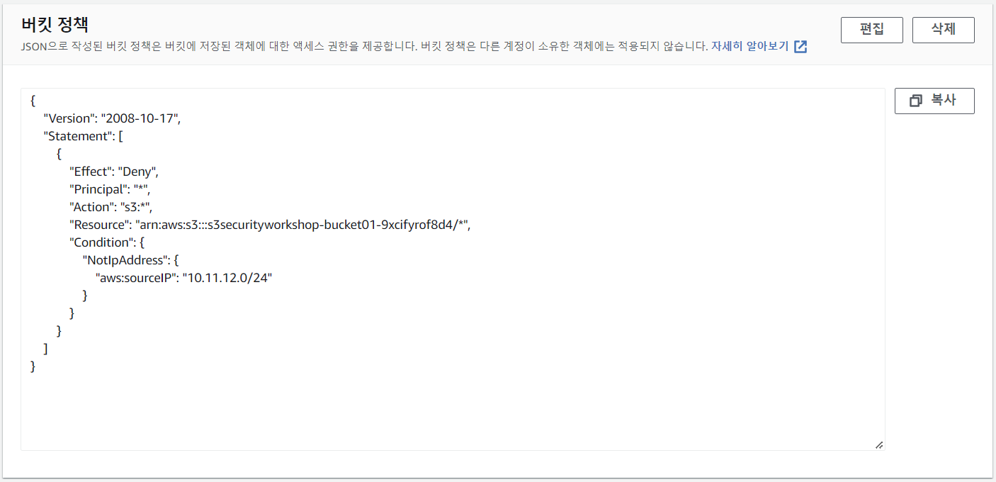 Amazon S3는 버킷에 액세스할 수 있는 IP 주소를 지정할 수 있습니다. "aws:sourceIP" 조건을 사용하여 해당 IP 주소에서 온 요청이 아니면 버킷에 대한 트래픽을 차단할 수 있습니다.실행 중인 인스턴스는 해당 IP 주소 범위에 있기 때문에 요청이 성공하는 것을 확인할 수 있습니다.