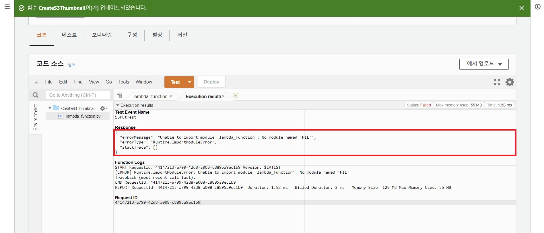 * 위 오류는 S3에 Thumbnail을 생성하기 위해 Python 3.7에서 사용되는 라이브러리인