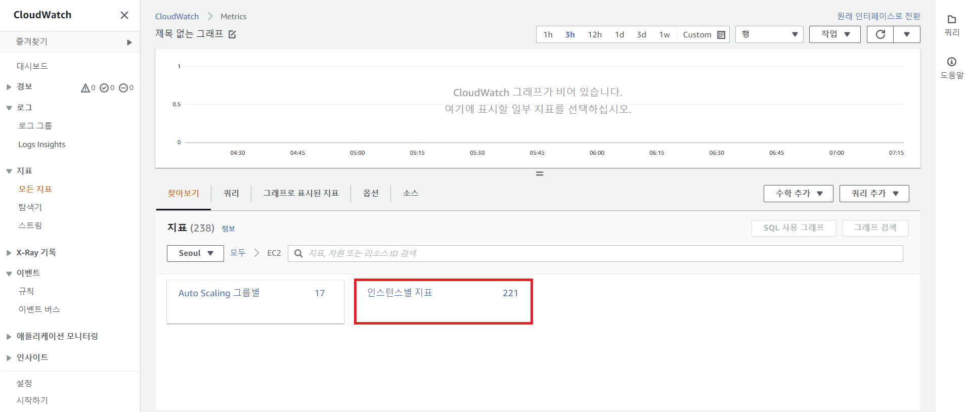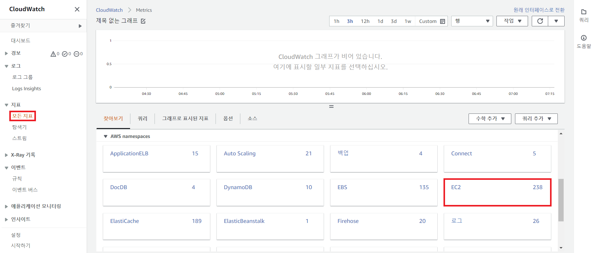 - 이러한 지표 중 기본으로 제공되는 지표와 세부 정보를 남기는 경우 별도의 비용이 과금되는 지표가 있다. 개별 서비스별로 사용 가능한 지표를 확인하기 위해서는 AWS 콘솔을 통해 CloudWatch에서 사용 가능한 지표를 확인할 수 있다.