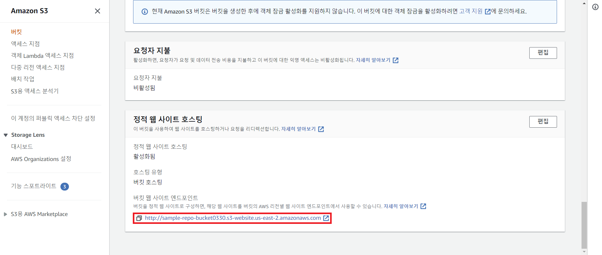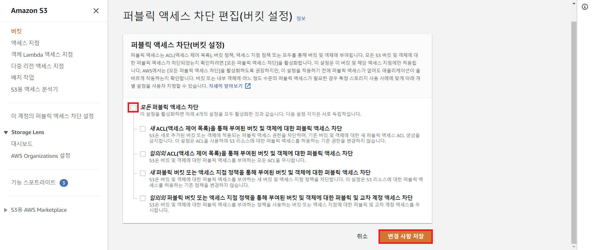 1. [서비스] -> [스토리지] -> [S3]로 이동하여 [버킷 만들기] 버튼을 클릭한다.2. 버킷 만들기 페이지에서 버킷 이름을 입력한 후, [버킷 만들기] 버튼을 클릭한다.3. 생성된 버킷의 속성 탭에서 정적 웹 사이트 호스팅 부분의 [편집] 버튼을 클릭한다.4. 정적 웹 사이트 호스팅 편집 페이지에서 정적 웹 사이트 호스팅에 [활성화]를 체크하고, 호스팅 유형을 [정적 웹 사이트 호스팅]으로 선택한 후, 인덱스 문서에 'index.html'을 입력하여 [변경 사항 저장] 버튼을 클릭한다.5. 이번엔 생성된 버킷의 권한 탭에서 퍼블릭 액세스 차단 부분의 [편집] 버튼을 클릭한다.6. 퍼블랙 액세스 차단 편집 페이지에서 모든 퍼블릭 액세스 차단의 체크 옵션을 해제하고 [변경 사항 저장] 버튼을 클릭한다.6. 그리고 버킷 정책 부분을 위와 같이 편집하여 저장한다.