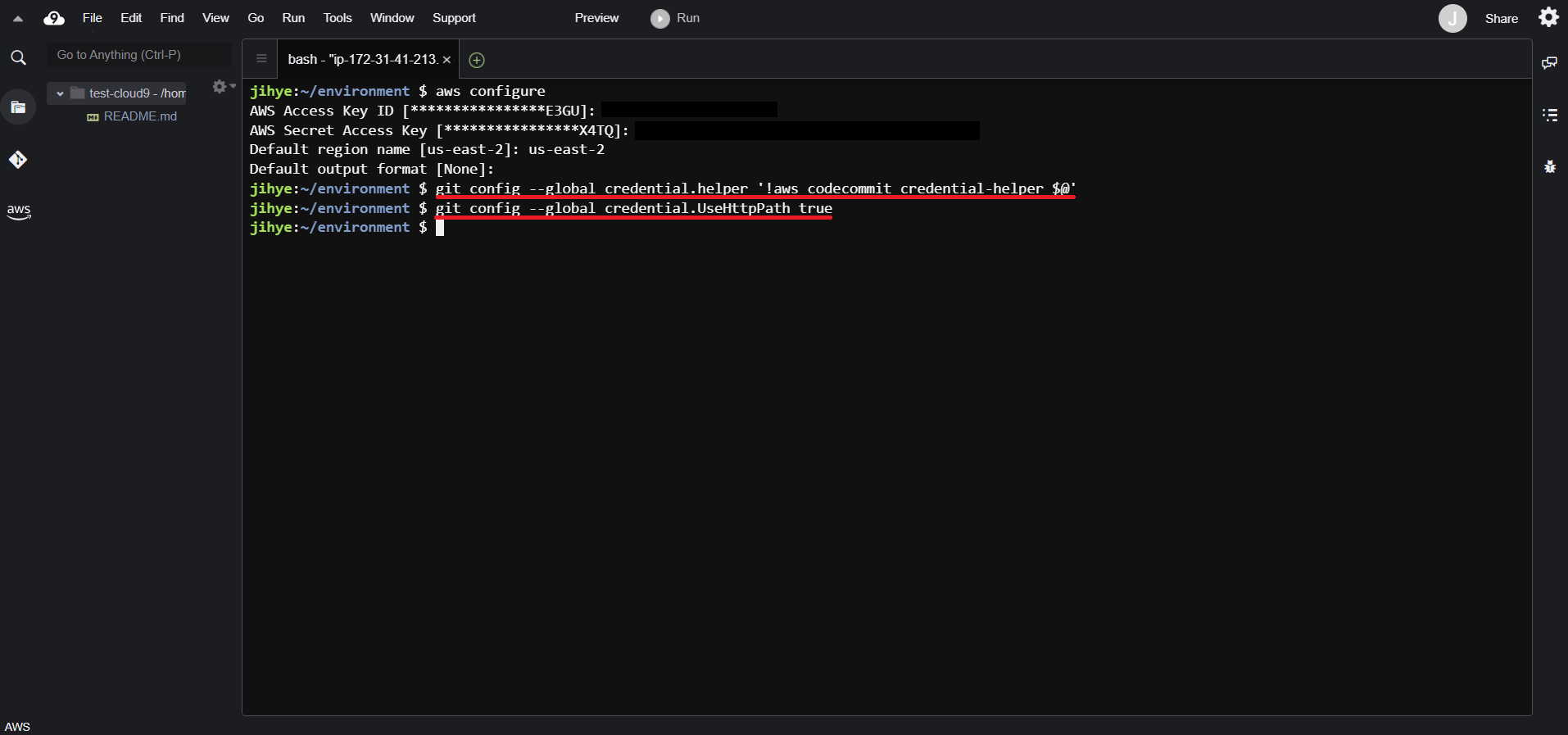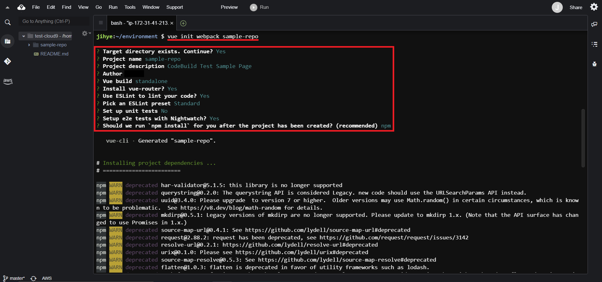 1. 콘솔에 로그인한 후, [서비스] -> [개발자 도구] -> [Cloud9]으로 이동하여 [Open IDE] 버튼을 클릭한다. 이전에 생성한 Cloud9 환경이 없다면 [Create environment] 버튼을 클릭하여 신규로 생성한다.2. 사용할 계정의 AWS CLI 설정을 진행하기 위해 AWS Configure 명령어를 실행한다.3. git config를 실행하여 AWS 자격 증명 프로필로 Git 자격 증명 헬퍼 사용을 지정하고, Git 자격 증명 헬퍼가 경로를 리포지토리로 전송할 수 있도록 한다.4. Vue.js와 Vue CLI를 설치하기 위해 npm 명령을 실행한다.5. Vue.js 프로젝트 생성 전에 CodeCommit 리포지토리를 생성하기 위해 Codecommit 콘솔에서 [리포지토리 생성] 버튼을 클릭한다.6. 리포지토리 생성 페이지에서 리포지토리 이름을 입력한 후, [생성] 버튼을 클릭한다.7. 리포지토리가 생성되면 [URL 복제] -> [HTTPS 복제] 버튼을 눌러 Git URL을 복사한다.8. Cloud9 콘솔에서 git clone 명령과 함께 복사된 Git URL을 추가하여 CodeCommit의 리포지토리를 clone한다.9. Vue.js WebPack을 활용하여 샘플을 생성하기 위해 위와 같이 명령어와 질문의 대답을 입력한다.10. Vue init 명령어를 통해 생성된 코드들을 CodeCommit으로 push하기 위해 위와 같이 명령어를 입력한다.11. CodeCommit 콘솔로 이동하여 소스가 정상적으로 push되었는지 확인한다.