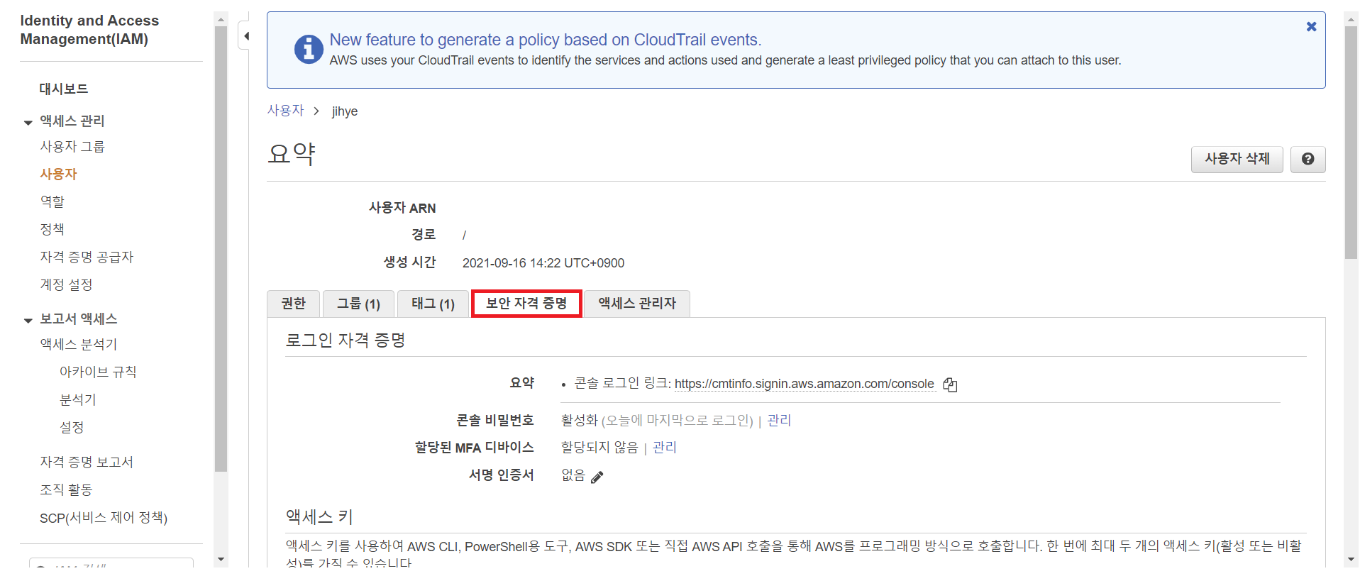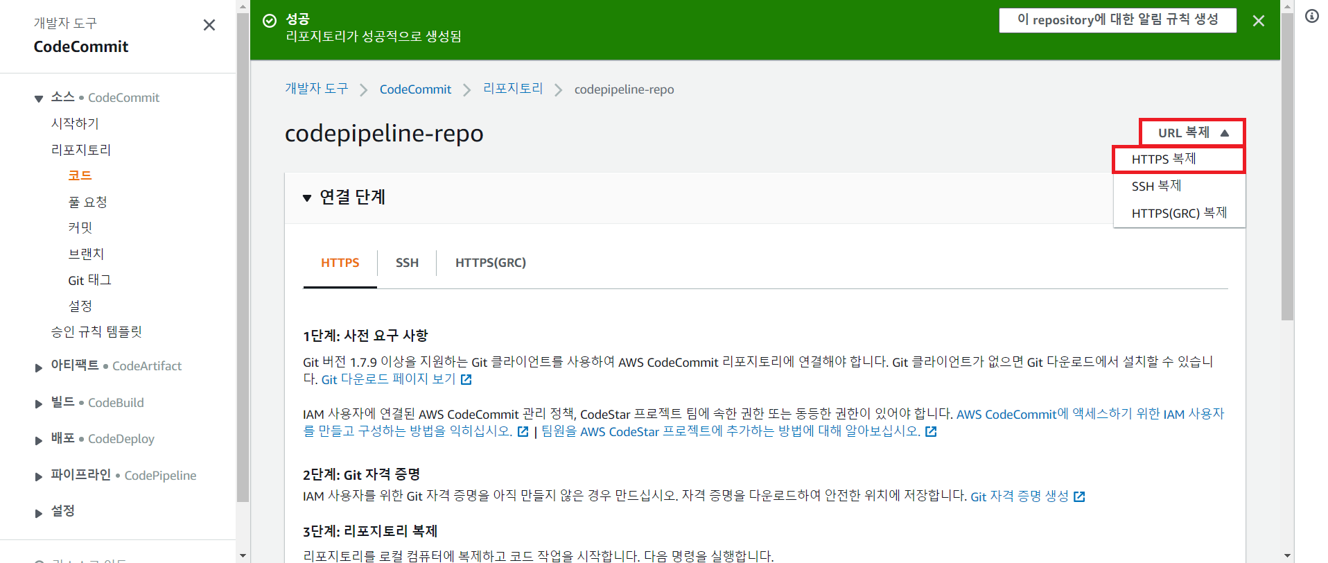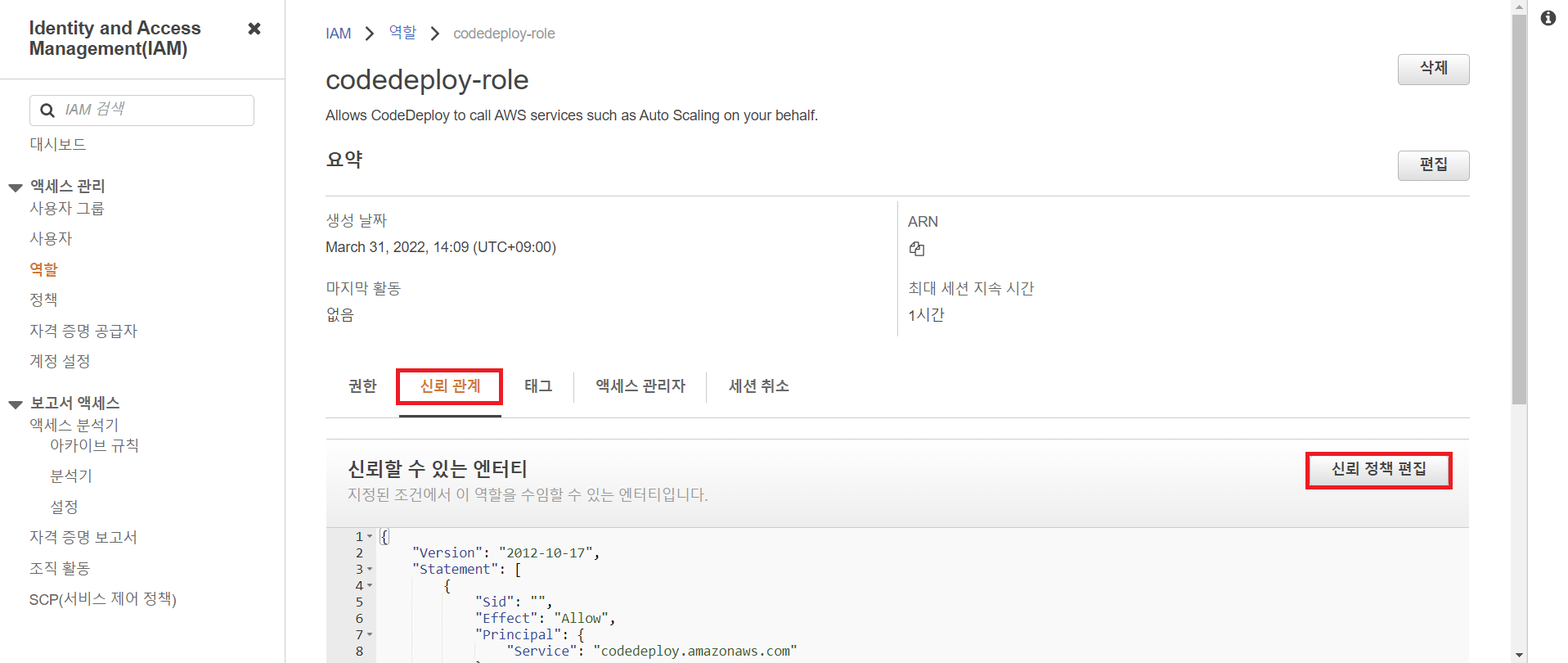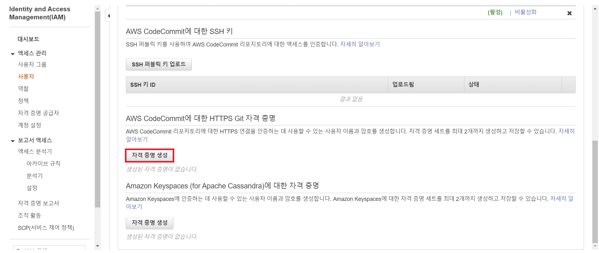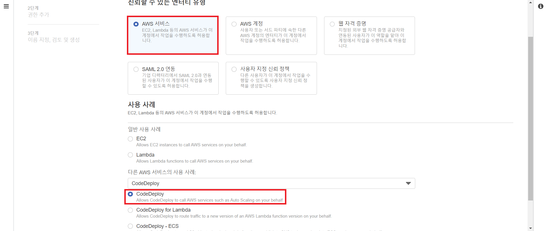 1. 콘솔에 로그인한 후, CodeCommit의 Git HTTP 접속을 위한 자격 증명 생성을 위해 AWSCodeCommitFullAccess와 AWSCodePipelineFullAccess 권한을 가진 사용자의 보안 자격 증명 탭으로 이동한다.2. AWS CodeCommit에 대한 HTTPS Git 자격 증명 항목에서 [자격 증명 생성] 버튼을 클릭하여 다운로드한다.3. CodeDeploy 서비스를 위한 역할 생성을 위해 [서비스] -> [보안, 자격 증명 및 규정준수] -> [IAM] -> [역할]로 이동하여 [역할 만들기] 버튼을 클릭한다.4. 신뢰할 수 있는 엔터티 선택 페이지에서 [AWS 서비스]와 [CodeDeploy]를 선택한 후, [다음] 버튼을 클릭한다.5. 권한 추가 페이지에서 [권한 경계 없이 역할 생성]을 선택한 후, [다음] 버튼을 클릭한다.6. 이름 지정, 검토 및 생성 페이지에서 역할 이름을 입력한 후, [역할 생성] 버튼을 클릭한다.7. 생성한 역할이 CodeDeploy에서 제공되는 모든 엔드포인트에 접속하기 위해 신뢰 관계 탭에서 [신뢰 정책 편집] 버튼을 클릭한다.8. 신뢰 정책 페이지에서 https://docs.aws.amazon.com/ko_kr/codedeploy/latest/userguide/getting-started-create-service-role.html 링크의 정책으로 수정한 후, [정책 업데이트] 버튼을 클릭한다.9. EC2 인스턴스에 대한 IAM 프로파일 생성을 위해 [IAM] -> [정책]으로 이동하여 [정책 생성] 버튼을 클릭한다.10. 정책 생성 페이지에서 https://docs.aws.amazon.com/ko_kr/codedeploy/latest/userguide/getting-started-create-iam-instance-profile.html 링크의 정책으로 수정한 후, [다음: 태그] 버튼을 클릭한다. (액세스할 버킷을 생성하여 해당 정책의 리소스 항목의 첫 줄에 반영한다.)11. 정책 이름을 입력하고 [정책 생성] 버튼을 클릭한다.12. 생성한 정책을 역할로 연결하기 위해 [IAM] -> [역할]로 이동하여 [역할 만들기] 버튼을 클릭한다.13. 신뢰할 수 있는 엔터티 선택 페이지에서 [AWS 서비스]와 [EC2]를 선택한 후, [다음] 버튼을 클릭한다.14. 권한 추가 페이지에서 생성한 정책을 선택한 후, [다음] 버튼을 클릭한다.15. 이름 지정, 검토 및 생성 페이지에서 역할 이름을 입력한 후, [역할 생성] 버튼을 클릭한다.