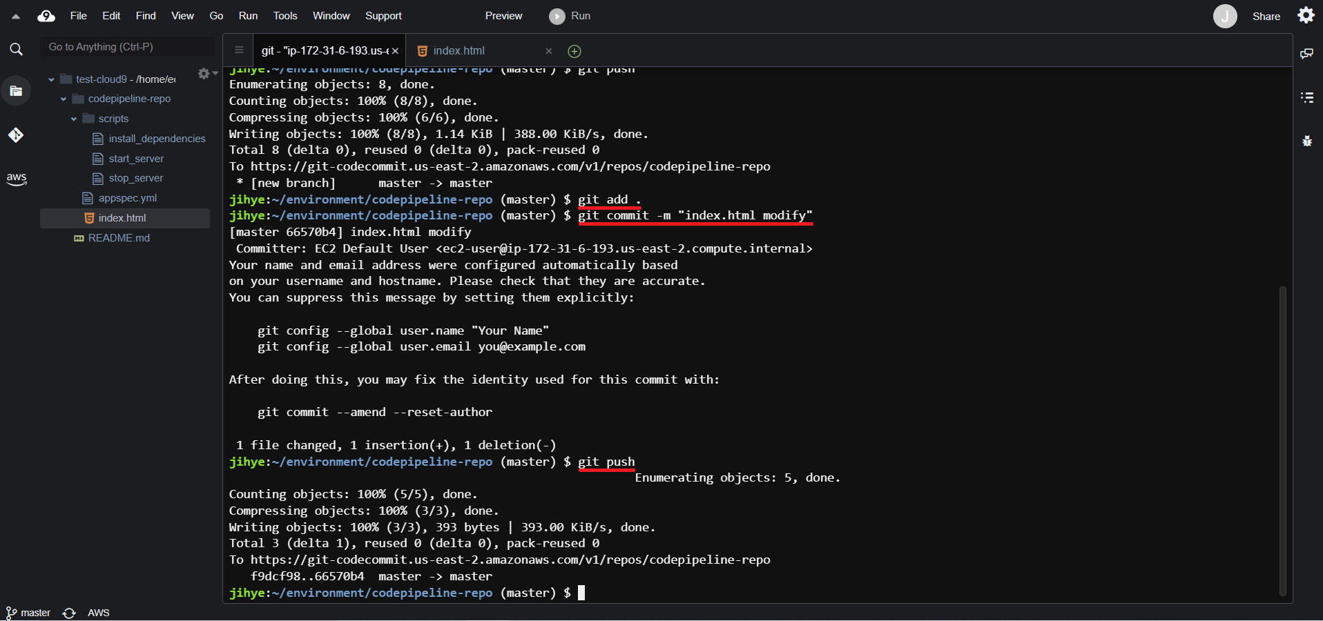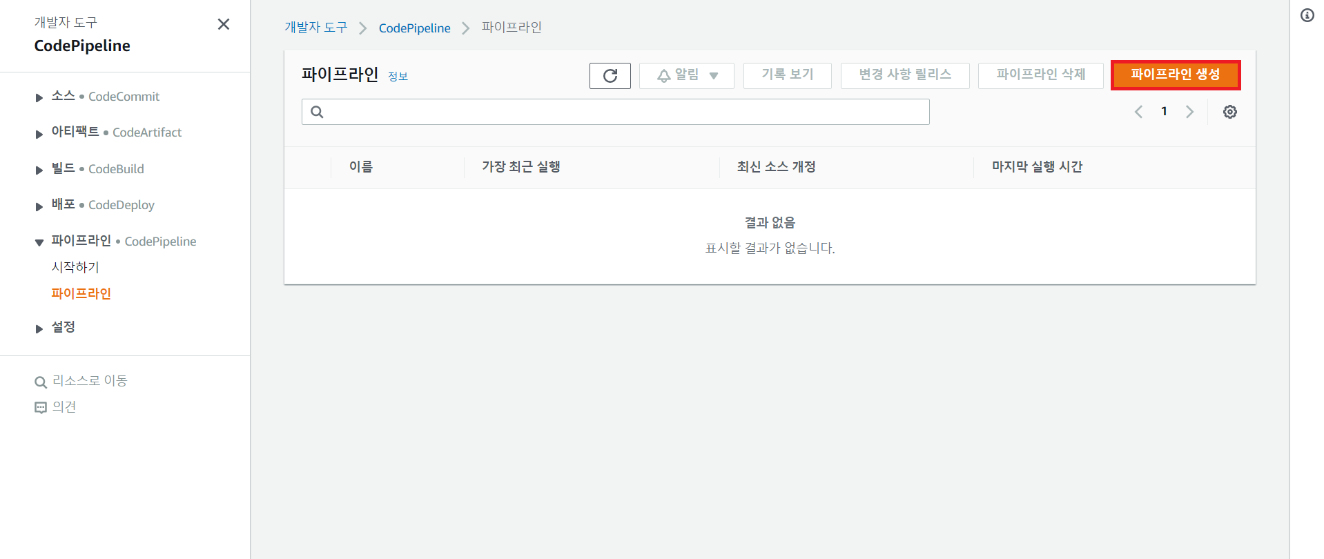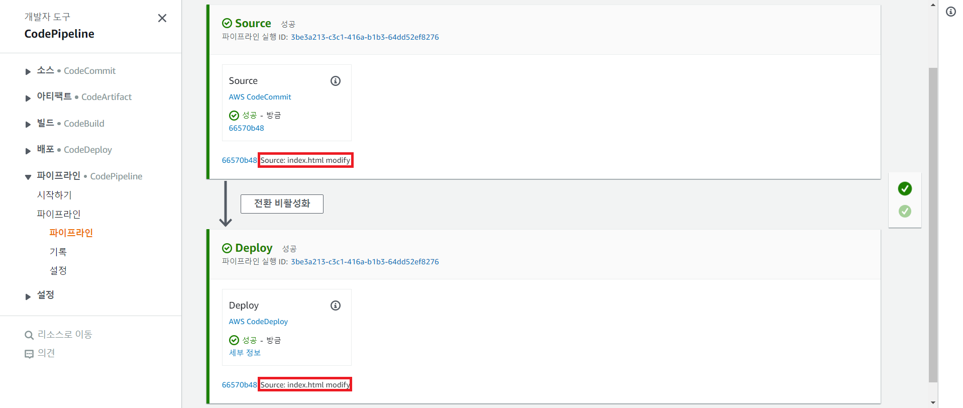 1. 파이프라인 생성을 위해 CodePipeline 콘솔로 이동하여 [파이프라인 생성] 버튼을 클릭한다.2. 파이프라인 설정 선택 페이지에서 이름을 입력하고, [새 서비스 역할]을 선택한다.3. [사용자 지정 위치]를 선택하여 액세스할 버킷을 선택한 후, [다음] 버튼을 클릭한다.4. 소스 스테이지 추가 페이지에서 생성한 리포지토리를 선택한 후, [다음] 버튼을 클릭한다.5. 빌드 스테이지 추가 페이지에서는 [빌드 스테이지 건더뛰기] 버튼을 클릭한다.6. 배포 스테이지 추가 페이지에서 생성한 배포 그룹을 선택한 후, [다음] 버튼을 클릭한다.7. 검토 페이지에서 설정한 구성을 확인한 후, [파이프라인 생성] 버튼을 클릭한다.8. 파이프라인이 정상적으로 등록되고 단계별로 작업 수행을 완료하면, 위와 같이 완료 메시지가 출력된다.9. 배포된 인스턴스의 퍼블릭 IPv4 DNS를 복사하여 웹 브라우저에 입력한다.10. 웹 페이지가 정상적으로 배포되었음을 확인한다.11. 변경된 소스의 자동 반영 여부를 확인하기 위해 Cloud9 콘솔로 이동하여 index.html 파일에 코드를 추가한다.12. 변경된 소스 파일을 CodeCommit으로 전송한다.13. CodePipeline 콘솔로 이동하면, 위와 같이 코드가 자동으로 배포된 것을 확인할 수 있다.14. 자동 배포 완료 후 웹 브라우저에 다시 접속하면, 변경된 HTML 코드가 정상적으로 반영되었음을 확인할 수 있다.