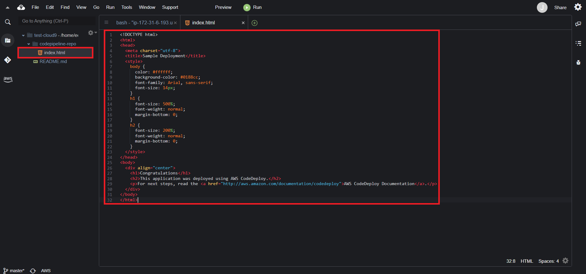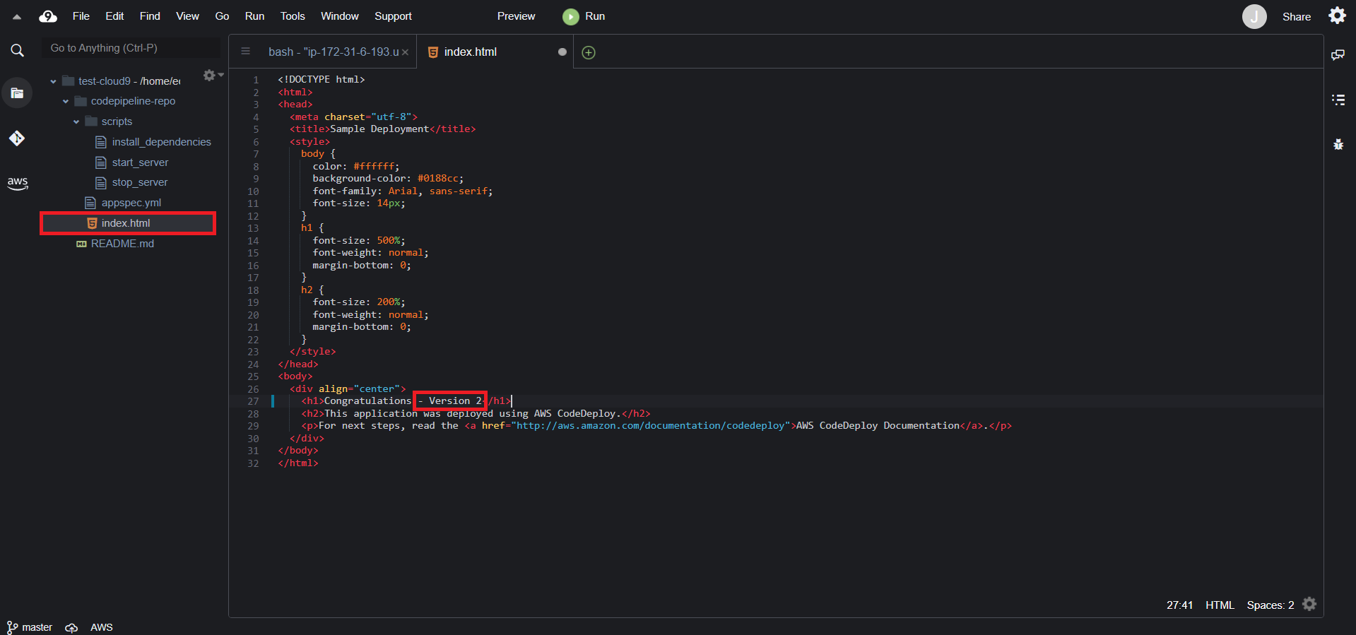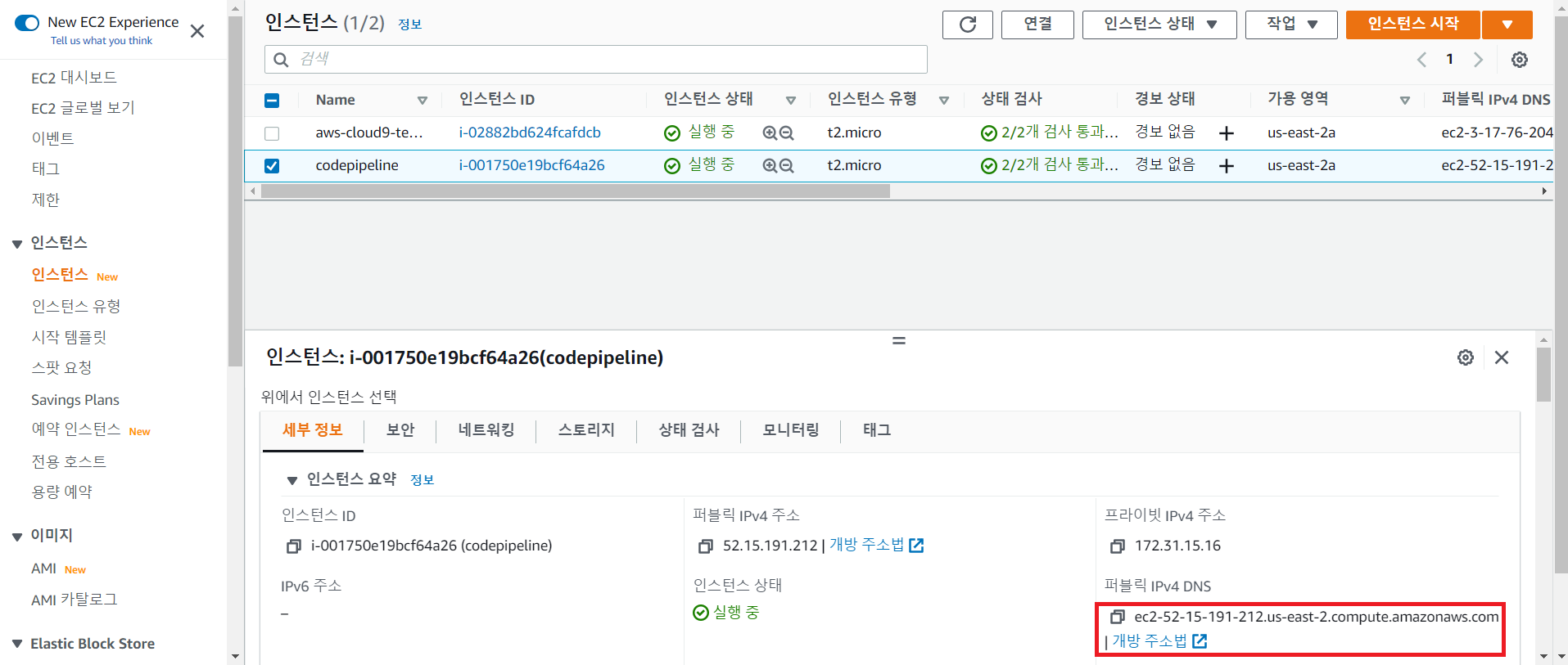 1. 파이프라인 생성을 위해 CodePipeline 콘솔로 이동하여 [파이프라인 생성] 버튼을 클릭한다.2. 파이프라인 설정 선택 페이지에서 이름을 입력하고, [새 서비스 역할]을 선택한다.3. [사용자 지정 위치]를 선택하여 액세스할 버킷을 선택한 후, [다음] 버튼을 클릭한다.4. 소스 스테이지 추가 페이지에서 생성한 리포지토리를 선택한 후, [다음] 버튼을 클릭한다.5. 빌드 스테이지 추가 페이지에서는 [빌드 스테이지 건더뛰기] 버튼을 클릭한다.6. 배포 스테이지 추가 페이지에서 생성한 배포 그룹을 선택한 후, [다음] 버튼을 클릭한다.7. 검토 페이지에서 설정한 구성을 확인한 후, [파이프라인 생성] 버튼을 클릭한다.8. 파이프라인이 정상적으로 등록되고 단계별로 작업 수행을 완료하면, 위와 같이 완료 메시지가 출력된다.9. 배포된 인스턴스의 퍼블릭 IPv4 DNS를 복사하여 웹 브라우저에 입력한다.10. 웹 페이지가 정상적으로 배포되었음을 확인한다.11. 변경된 소스의 자동 반영 여부를 확인하기 위해 Cloud9 콘솔로 이동하여 index.html 파일에 코드를 추가한다.12. 변경된 소스 파일을 CodeCommit으로 전송한다.13. CodePipeline 콘솔로 이동하면, 위와 같이 코드가 자동으로 배포된 것을 확인할 수 있다.14. 자동 배포 완료 후 웹 브라우저에 다시 접속하면, 변경된 HTML 코드가 정상적으로 반영되었음을 확인할 수 있다.