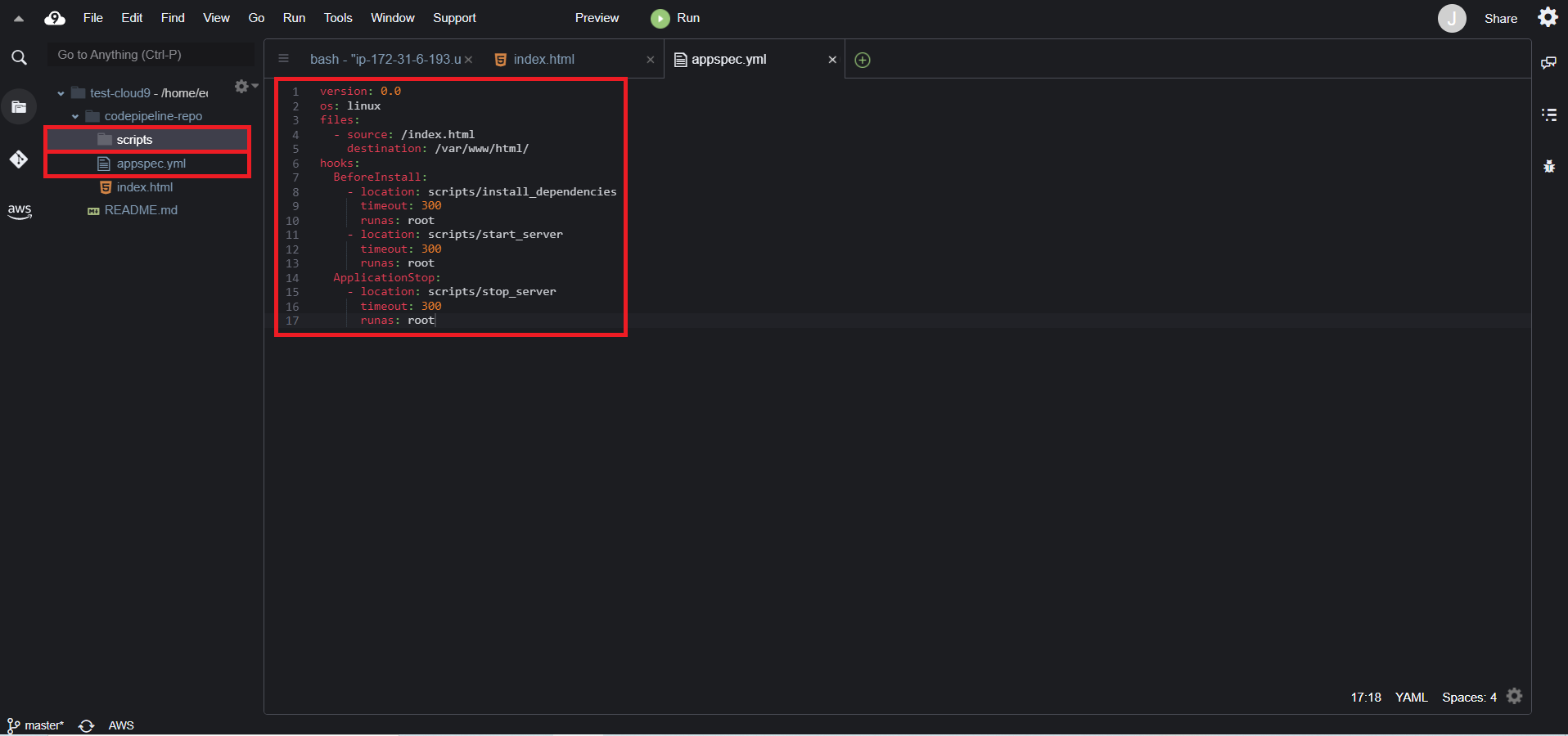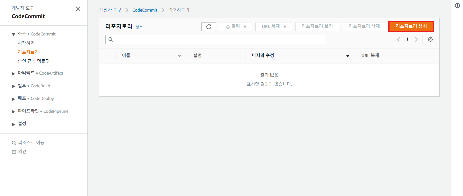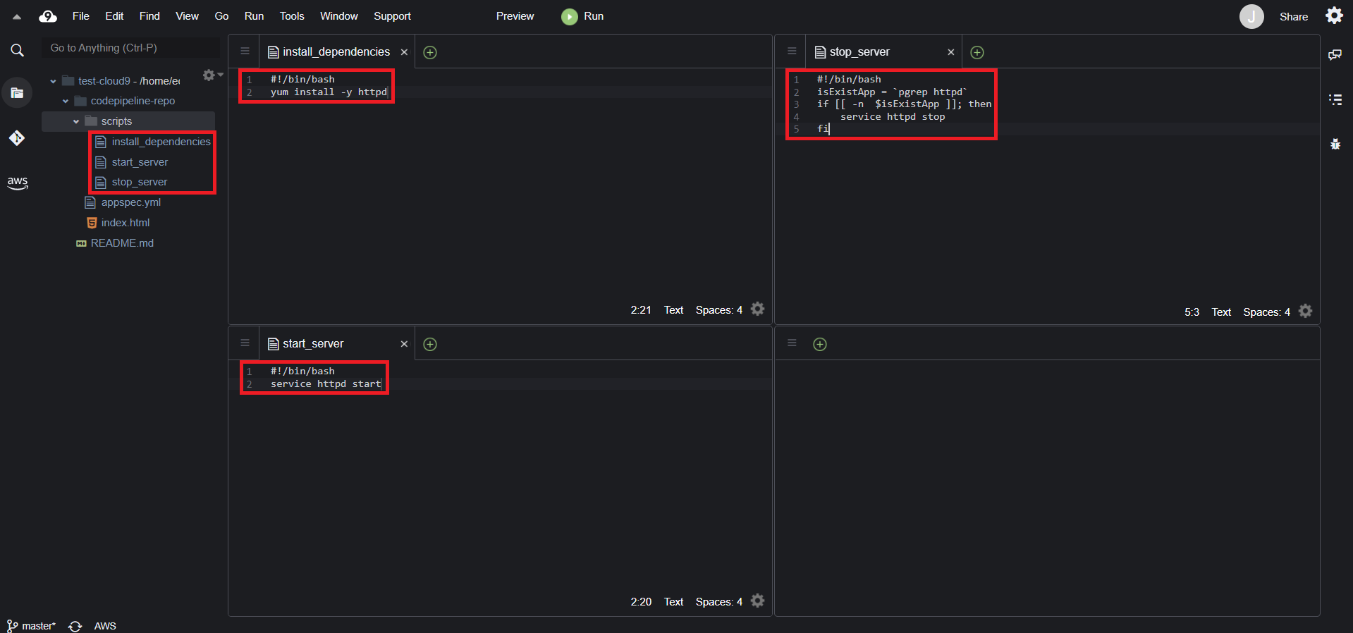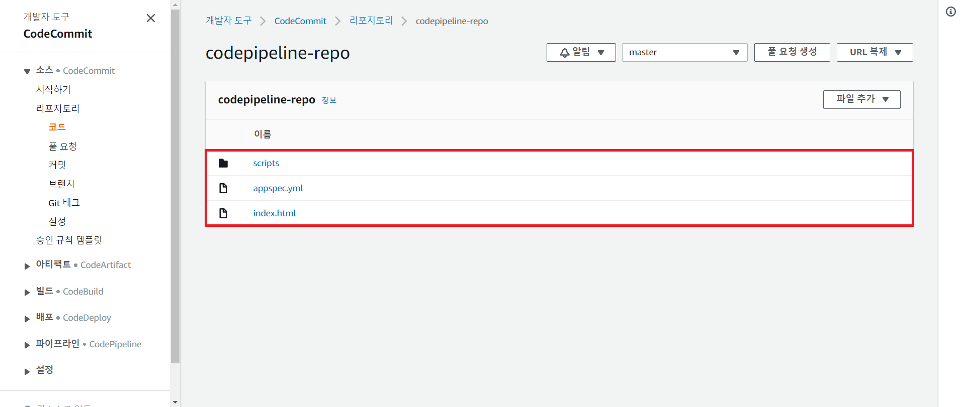 1. [서비스] -> [개발자 도구] -> [Cloud9]으로 이동하여 [Open IDE] 버튼을 클릭한다. 이전에 생성한 Cloud9 환경이 없다면 [Create environment] 버튼을 클릭하여 신규로 생성한다.2. Cloud9 콘솔에서 AWS CLI 설정을 진행하기 위해 AWS Configure 명령을 실행한다.3. git config를 실행하여 AWS 자격 증명 프로필로 Git 자격 증명 헬퍼 사용을 지정하고, Git 자격 증명 헬퍼가 경로를 리포지토리로 전송할 수 있도록 한다.4. 리포지토리 생성을 위해 CodeCommit 콘솔로 이동하여 [리포지토리 생성] 버튼을 클릭한다.5. 리포지토리 생성 페이지에서 이름을 입력한 후, [생성] 버튼을 클릭한다.6. 리포지토리가 생성되면 [URL 복제] -> [HTTPS 복제] 버튼을 눌러 Git URL을 복사한다.7. git clone 명령과 함께 복사된 Git URL을 추가하여 CodeCommit의 리포지토리를 clone한다.8. 복제된 codepipeline-repo 폴더에 index.html 파일을 생성하여 HTML 소스를 작성한다.9. codepipeline-repo 폴더에 appspec.yml 파일을 생성하여 appspec 정보를 작성하고 저장한 후, scripts 폴더를 생성한다.10. 생성한 scripts 폴더에 install_dependencies, start_server, stop_server 파일을 생성하고 위와 같이 작성한다.11. 작성한 소스 파일들을 CodeCommit으로 전송한다.12. 다시 CodeCommit 콘솔로 이동하여 소스 파일들이 정상적으로 전송됨을 확인한다.