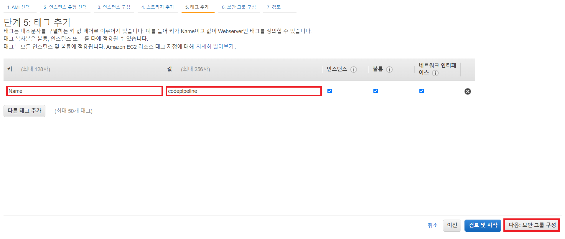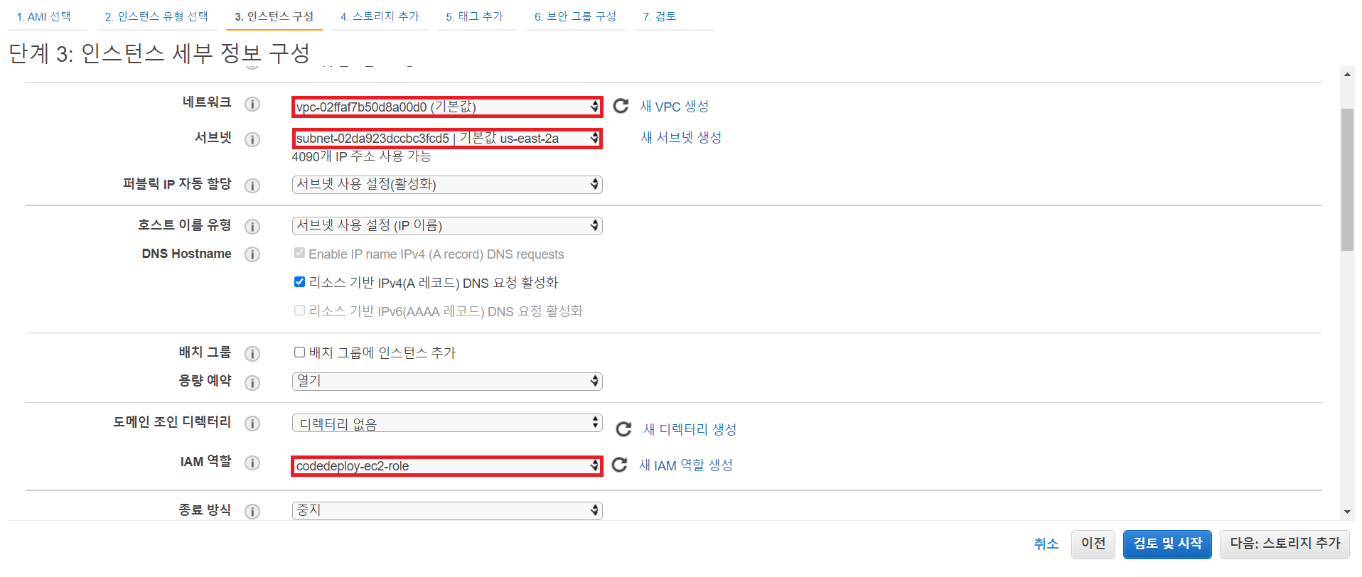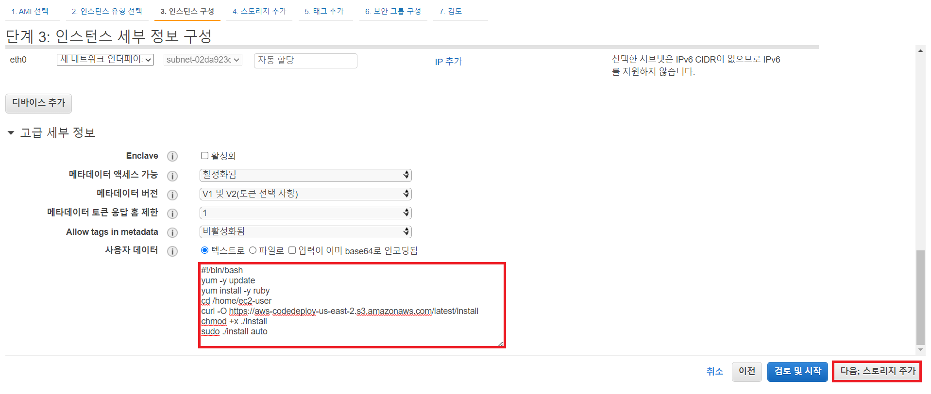 1. EC2 인스턴스 생성을 위해 EC2 콘솔로 이동하여 [인스턴스 시작] 버튼을 클릭한다.2. AMI 선택 페이지에서 Amazon Linux 2 AMI의 [선택] 버튼을 클릭한다.3. 인스턴스 유형 선택 페이지에서 t2.micro를 선택한 후, [다음: 인스턴스 세부 정보 구성] 버튼을 클릭한다.4. 인스턴스 세부 정보 구성 페이지에서 네트워크와 서브넷을 선택한 후, IAM 역할을 이전에 생성한 인스턴스 프로파일 역할로 선택한다.5. 사용자 데이터에 위와 같이 내용을 입력한 후, [다음: 스토리지 추가] 버튼을 클릭한다. 선택한 리전이 다른 경우 본인의 서비스 리전으로 다운로드 주소를 수정한다.6. 스토리지 추가 페이지에서는 디폴트로 두고 [다음: 태그 추가] 버튼을 클릭한다.7. 태그 추가 페이지에서 키와 값을 입력한 후, [다음: 보안 그룹 구성] 버튼을 클릭한다.8. 보안 그룹 구성 페이지에서 새 보안 그룹을 생성하여 80번 포트를 허용하는 규칙을 추가한 후, [검토 및 시작] 버튼을 클릭한다.9. 새 키 페어를 생성하여 다운로드한 후, [인스턴스 시작] 버튼을 클릭한다.10. CodeDeploy 배포 그룹 생성을 위해 CodeDeploy 콘솔로 이동하여 [애플리케이션 생성] 버튼을 클릭한다.11. 애플리케이션 생성 페이지에서 이름을 입력하고, 컴퓨팅 플랫폼으로 [EC2/온프레미스]를 선택한 후, [애플리케이션 생성] 버튼을 클릭한다.12. 생성된 애플리케이션의 배포 그룹 탭에서 [배포 그룹 생성] 버튼을 클릭한다.13. 배포 그룹 생성 페이지에서 이름을 입력하고, 이전에 생성한 서비스 역할을 선택한다.14. 배포 유형으로 [현재 위치]를 선택하고, 환경 구성은 [Amazon EC2 인스턴스]를 선택하여 이전에 생성한 인스턴스의 태그를 입력한다.15. [로드 밸런싱 활성화] 체크박스를 해제하고, 나머지는 항목들은 디폴트로 두어 [배포 그룹 생성] 버튼을 클릭한다.