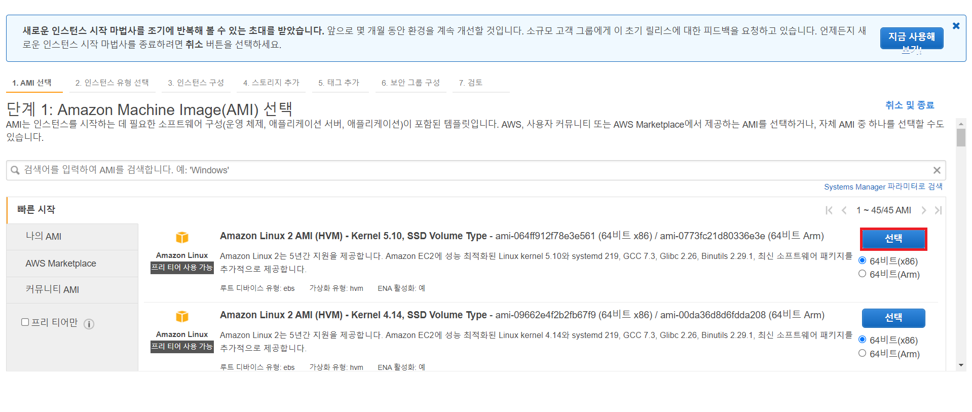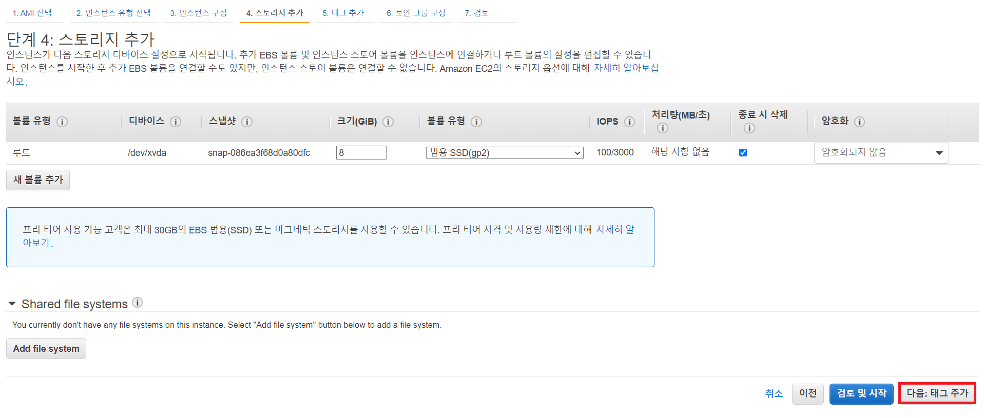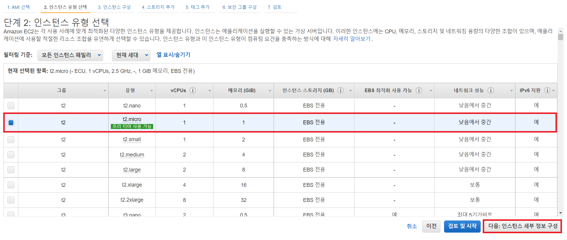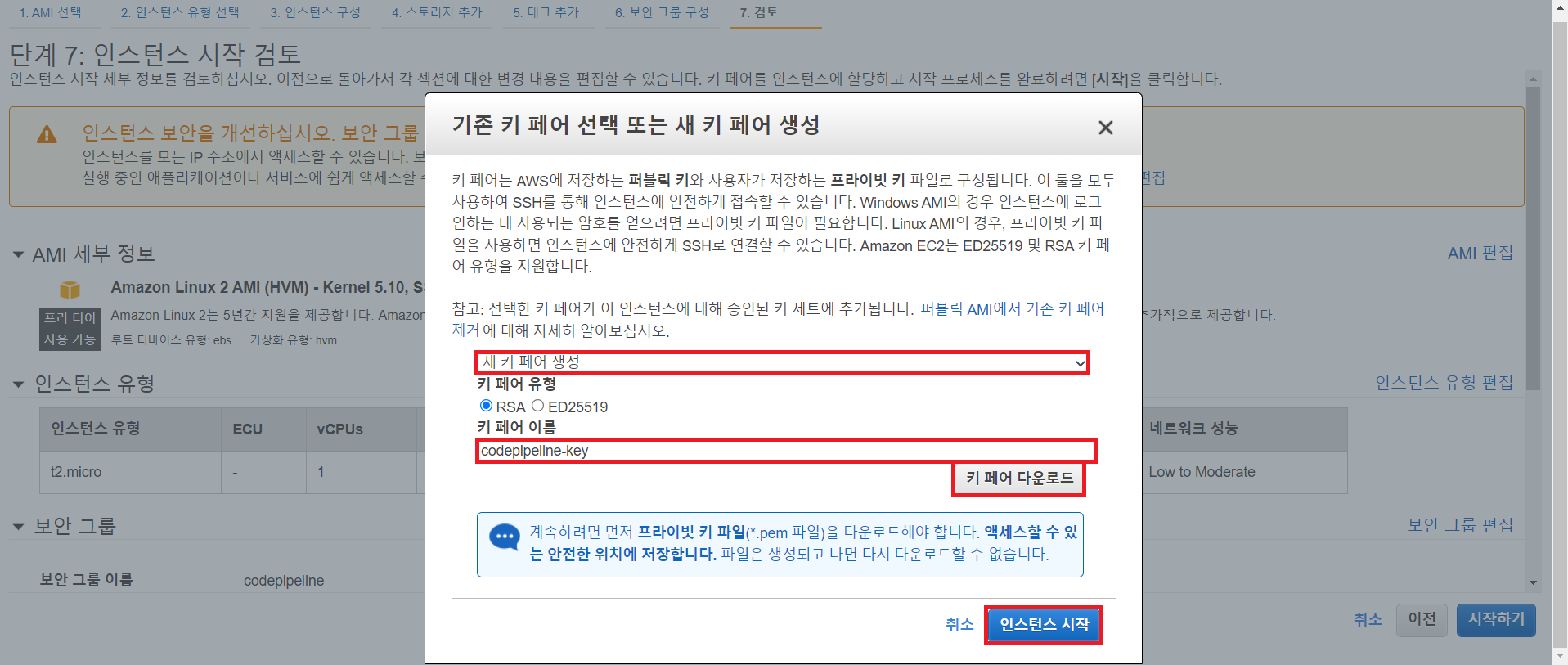 1. EC2 인스턴스 생성을 위해 EC2 콘솔로 이동하여 [인스턴스 시작] 버튼을 클릭한다.2. AMI 선택 페이지에서 Amazon Linux 2 AMI의 [선택] 버튼을 클릭한다.3. 인스턴스 유형 선택 페이지에서 t2.micro를 선택한 후, [다음: 인스턴스 세부 정보 구성] 버튼을 클릭한다.4. 인스턴스 세부 정보 구성 페이지에서 네트워크와 서브넷을 선택한 후, IAM 역할을 이전에 생성한 인스턴스 프로파일 역할로 선택한다.5. 사용자 데이터에 위와 같이 내용을 입력한 후, [다음: 스토리지 추가] 버튼을 클릭한다. 선택한 리전이 다른 경우 본인의 서비스 리전으로 다운로드 주소를 수정한다.6. 스토리지 추가 페이지에서는 디폴트로 두고 [다음: 태그 추가] 버튼을 클릭한다.7. 태그 추가 페이지에서 키와 값을 입력한 후, [다음: 보안 그룹 구성] 버튼을 클릭한다.8. 보안 그룹 구성 페이지에서 새 보안 그룹을 생성하여 80번 포트를 허용하는 규칙을 추가한 후, [검토 및 시작] 버튼을 클릭한다.9. 새 키 페어를 생성하여 다운로드한 후, [인스턴스 시작] 버튼을 클릭한다.10. CodeDeploy 배포 그룹 생성을 위해 CodeDeploy 콘솔로 이동하여 [애플리케이션 생성] 버튼을 클릭한다.11. 애플리케이션 생성 페이지에서 이름을 입력하고, 컴퓨팅 플랫폼으로 [EC2/온프레미스]를 선택한 후, [애플리케이션 생성] 버튼을 클릭한다.12. 생성된 애플리케이션의 배포 그룹 탭에서 [배포 그룹 생성] 버튼을 클릭한다.13. 배포 그룹 생성 페이지에서 이름을 입력하고, 이전에 생성한 서비스 역할을 선택한다.14. 배포 유형으로 [현재 위치]를 선택하고, 환경 구성은 [Amazon EC2 인스턴스]를 선택하여 이전에 생성한 인스턴스의 태그를 입력한다.15. [로드 밸런싱 활성화] 체크박스를 해제하고, 나머지는 항목들은 디폴트로 두어 [배포 그룹 생성] 버튼을 클릭한다.