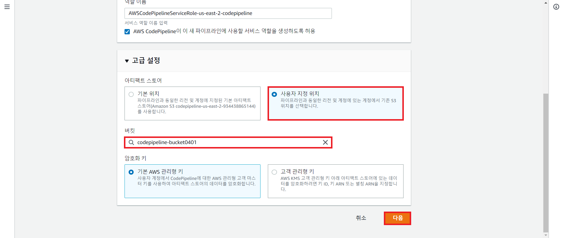 파이프라인: S/W 변경 사항이 배포 프로세스의 적용 방법을 설명하는 워크플로우를 구성하며, AWS 계정 당 리전 별 300개의 파이프라인 생성이 가능하다. 콘솔에서 파이프라인 생성 시 각 파이프라인 당 S3 버킷에 폴더를 생성하고, 파이프라인에서 배포 프로세스가 실행되면 각 폴더에 아티팩트를 저장한다.