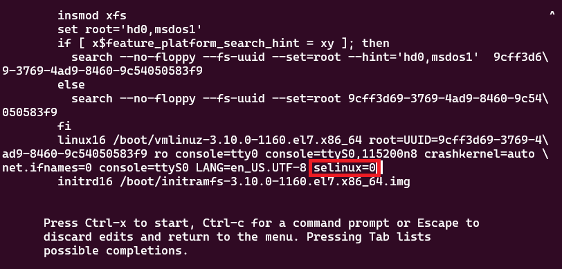 fi 부분의 맨 끝에 selinux=0 옵션을 추가한 후, Ctrl + x를 눌러 재부팅한다.
