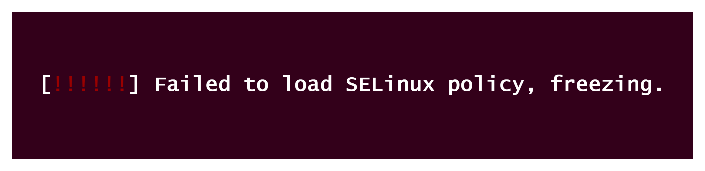 리눅스를 부팅하다가 위와 같은 에러 메시지를 마주하게 된다면, 바로 /etc/selinux/config 파일 설정이 잘못된 경우다.