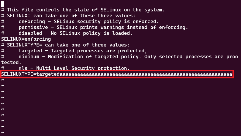 바로 SELINUXTYPE 옵션의 오타 때문에 Failed to load SELinux policy, freezing. 에러가 발생한 것이다.
