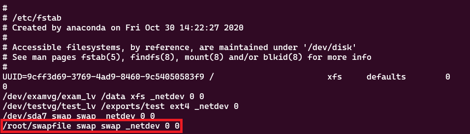 마찬가지로 부팅 시에 자동으로 swap 파일이 활성화될 수 있도록 /etc/fstab 파일에 등록한다.