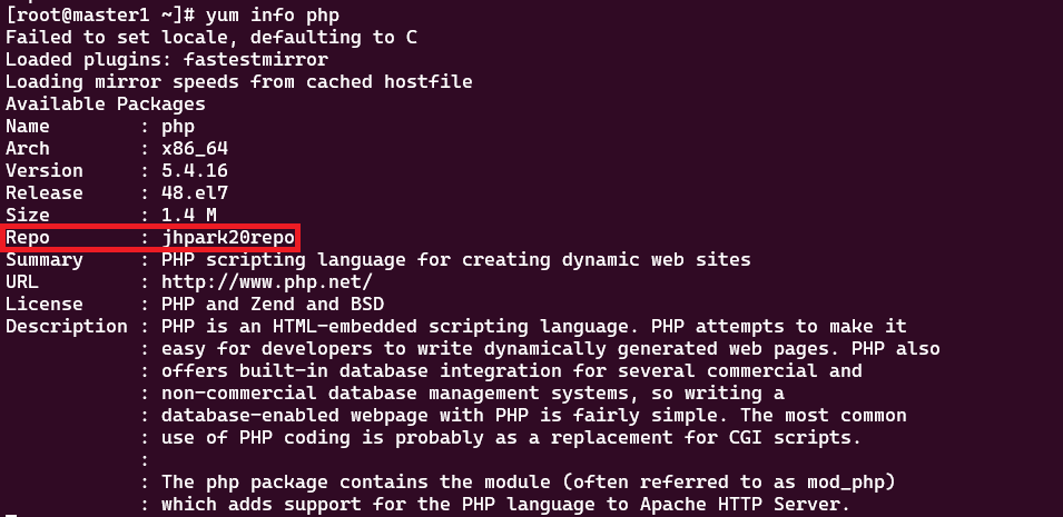 그리고 yum info 명령어를 통해 해당 Package가 생성한 Repository로 조회되는 것을 확인할 수 있다.