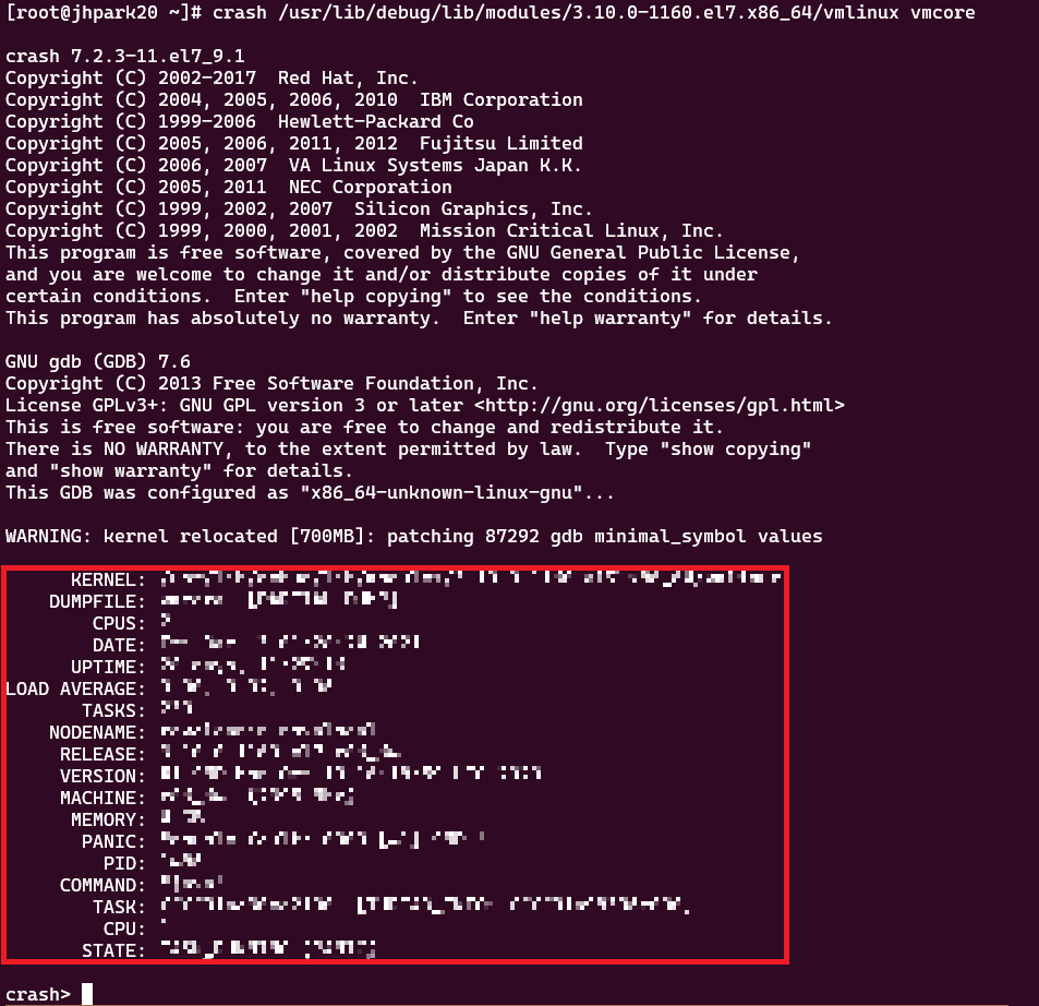 [root@jhpark20 ~]# crash [vmlinux 파일] [vmcore 파일]