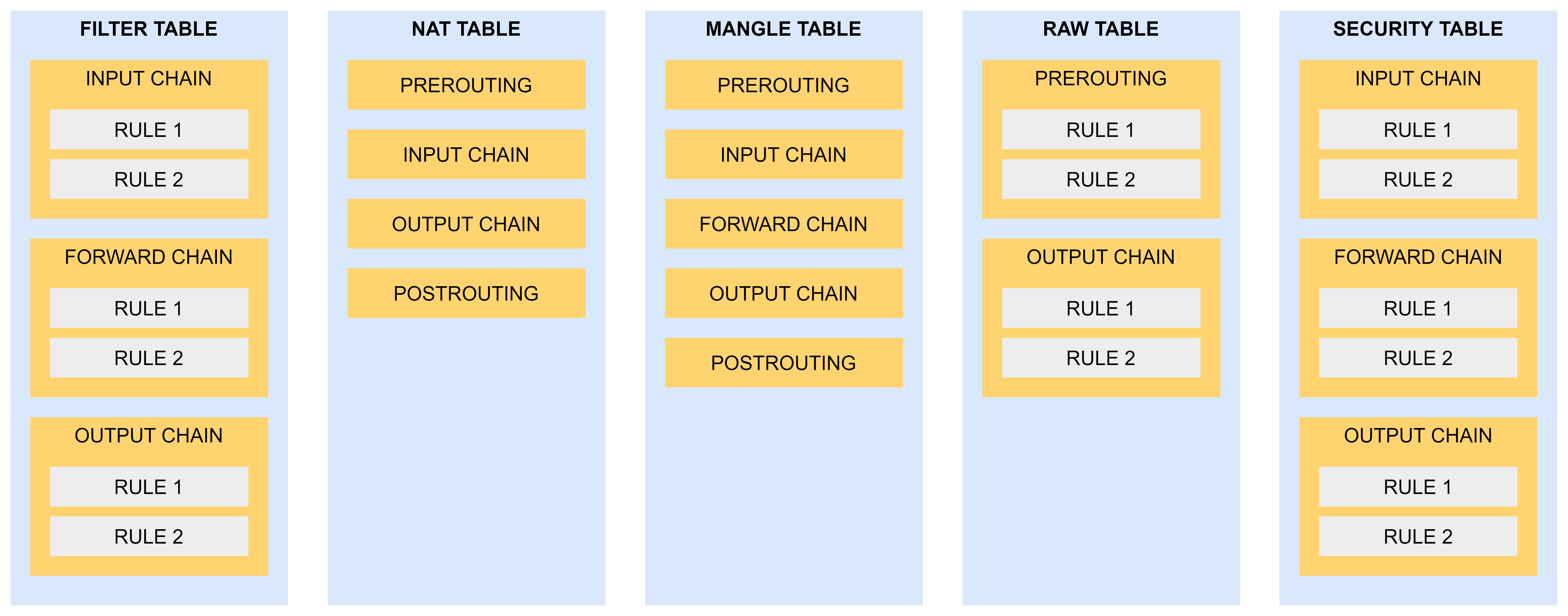 아래와 같이 iptables는 서로 다른 종류의 패킷 처리를 기능적으로 분리하기 위해 Table이라는 개념을 사용하는데, 이 Table들은 Chain을 가지고 있고, 이 Chain들은 Rule을 가지고 있다.