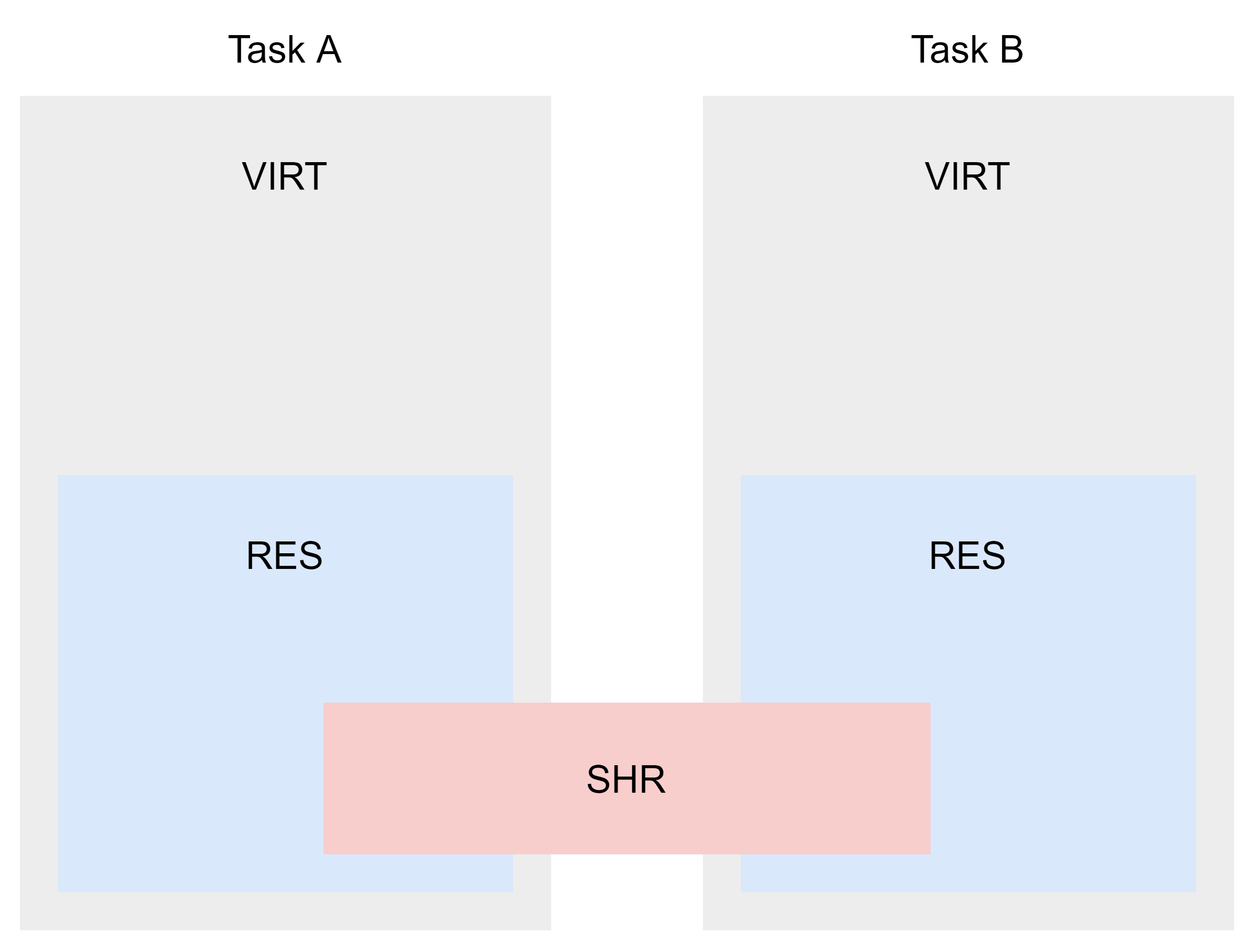 VIRT(Virtual Memory Size)는 task에 할당된 가상 메모리의 전체 용량이며, RES(Resident Memory Size)는 그중에서 task가 실제로 사용하고 있는 물리 메모리의 양이고, SHR(Shared Memory Size)은 다른 task와 공유하고 있는 공유 메모리의 양이다.