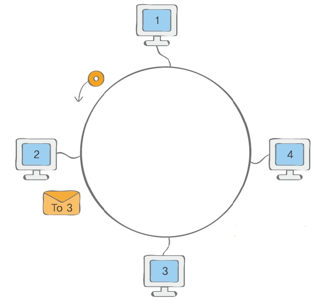 토큰을 가진 PC만이 네트워크에 데이터를 실어보낼 수 있으며, 데이터를 다 보내고 나면 바로 옆 PC에 토큰을 전달하는 방식으로 통신이 이루어진다.