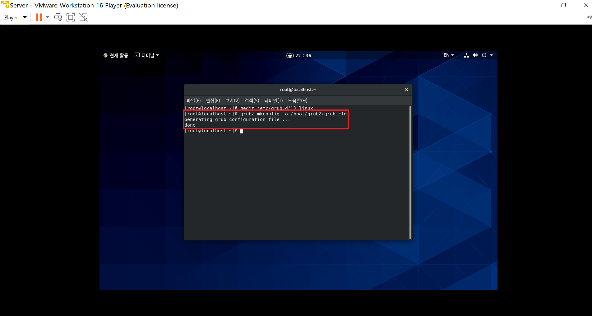 grub-mkconfig -o /boot/grub2/grub.cfg → 변경한 내용을 적용