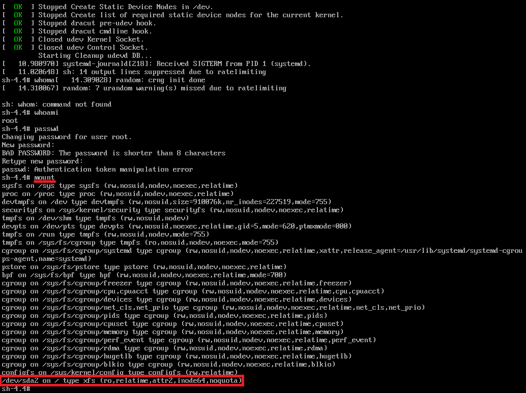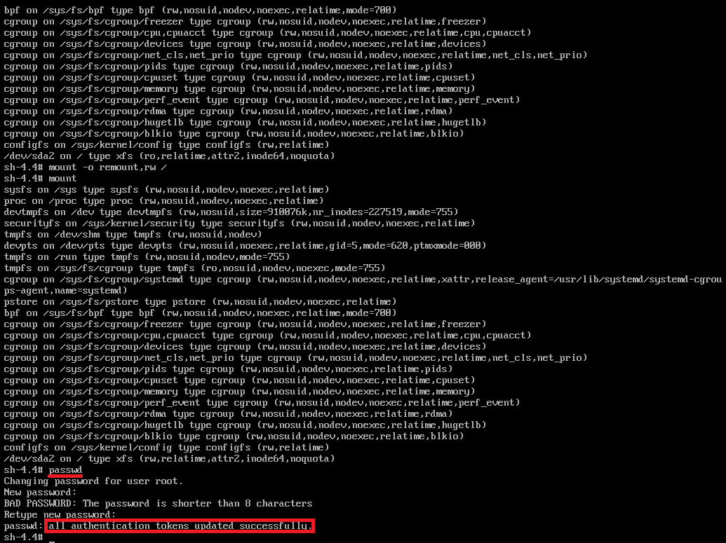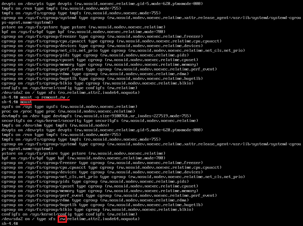 * 현재 '/' 파티션이 읽기 전용으로 마운트되었기 때문에 비민번호를 변경하는 데 오류가 발생한다. *